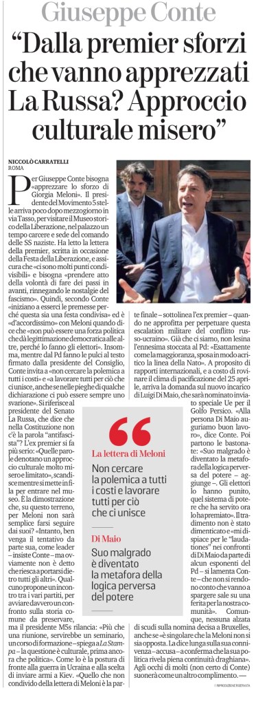 Per Giuseppe Conte bisogna «apprezzare lo sforzo di Giorgia Meloni». Il presidente del Movimento 5 stelle arriva poco dopo mezzogiorno in via Tasso, per visitare il Museo storico della Liberazione, nel palazzo un tempo carcere e sede del comando delle SS naziste. Ha letto la lettera della premier, scritta in occasione della Festa della Liberazione, e assicura che «ci sono molti punti condivisibili» e bisogna «prendere atto della volontà di fare dei passi in avanti, rinnegando le nostalgie del fascismo». Quindi, secondo Conte «iniziano a esserci le premesse perché questa sia una festa condivisa» ed è «d’accordissimo» con Meloni quando dice che «non può essere una forza politica che dà legittimazione democratica alle altre, perché lo fanno gli elettori». Insomma, mentre dal Pd fanno le pulci al testo firmato dalla presidente del Consiglio, Conte invita a «non cercare la polemica a tutti i costi» e «a lavorare tutti per ciò che ci unisce, anche se nelle pieghe di qualche dichiarazione ci può essere sempre uno svarione». Si riferisce al presidente del Senato La Russa, che dice che nella Costituzione non c’è la parola “antifascista”? L’ex premier si fa più serio: «Quelle parole denotano un approccio culturale molto misero e limitato», scandisce mentre si mette in fila per entrare nel museo. È la dimostrazione che, su questo terreno, per Meloni non sarà semplice farsi seguire dai suoi? «Intanto, ben venga il tentativo da parte sua, come leader – insiste Conte – ma ovviamente non è detto che riesca a portarsi dietro tutti gli altri». Qualcuno propone un incontro tra i vari partiti, per avviare davvero un confronto sulla storia comune da preservare, ma il presidente M5s rilancia: «Più che una riunione, servirebbe un seminario, un corso di formazione – spiega a La Stampa – la questione è culturale, prima ancora che politica». Come lo è la postura di fronte alla guerra in Ucraina e alla scelta di inviare armi a Kiev. «Quello che non condivido della lettera di Meloni è la parte finale – sottolinea l’ex premier – quando ne approfitta per perpetuare questa escalation militare del conflitto russo-ucraino». Già che ci siamo, non lesina l’ennesima stoccata al Pd: «Esattamente come la maggioranza, sposa in modo acritico la linea della Nato». A proposito di rapporti internazionali, e a costo di rovinare il clima di pacificazione del 25 aprile, arriva la domanda sul nuovo incarico di Luigi Di Maio, che sarà nominato inviato speciale Ue per il Golfo Persico. «Alla persona Di Maio auguriamo buon lavoro», dice Conte. Poi partono le bastonate: «Suo malgrado è diventato la metafora della logica perversa del potere – aggiunge –. Gli elettori lo hanno punito, quel sistema di potere che ha servito ora lo ha premiato». Il tradimento non è stato dimenticato e «mi dispiace per le “laudationes” nei confronti di Di Maio da parte di alcun esponenti del Pd – si lamenta Conte – che non si rendono conto che vanno a spargere sale su una ferita per la nostra comunità». Comunque, nessuna alzata di scudi sulla nomina decisa a Bruxelles, anche se «è singolare che la Meloni non si sia opposta. La dice lunga sulla sua connivenza – accusa – a conferma che la sua politica rivela piena continuità draghiana». Agli occhi di molti (non certo di Conte) suonerà come un altro complimento. —