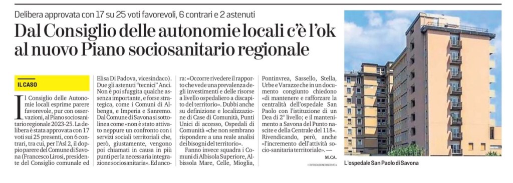 Il Consiglio delle Autonomie locali esprime parere favorevole, pur con osservazioni, al Piano sociosanitario regionale 2023-25. La delibera è stata approvata con 17 voti sui 25 presenti, con 6 contrari, tra cui, per l’Asl 2, il doppio parere del Comune di Savona (Francesco Lirosi, presidente del Consiglio comunale ed Elisa Di Padova, vicesindaco). Due gli astenuti “tecnici” Anci. Non è poi sfuggita qualche assenza importante, e forse strategica, come i Comuni di Albenga, e Imperia e Sanremo. Dal Comune di Savona si sottolinea come «non è stato attivato neppure un confronto con i servizi sociali territoriali che, però, giustamente, vengono poi chiamati in causa in più punti per la necessaria integrazione sociosanitaria». Ed ancora: «Occorre rivedere il rapporto che vede una prevalenza degli investimenti e delle risorse a livello ospedaliero a discapito del territorio». Dubbi anche su definizione e localizzazione di Case di Comunità, Punti Unici di accesso, Ospedali di Comunità «che non sembrano rispondere a una reale analisi dei bisogni del territorio».
