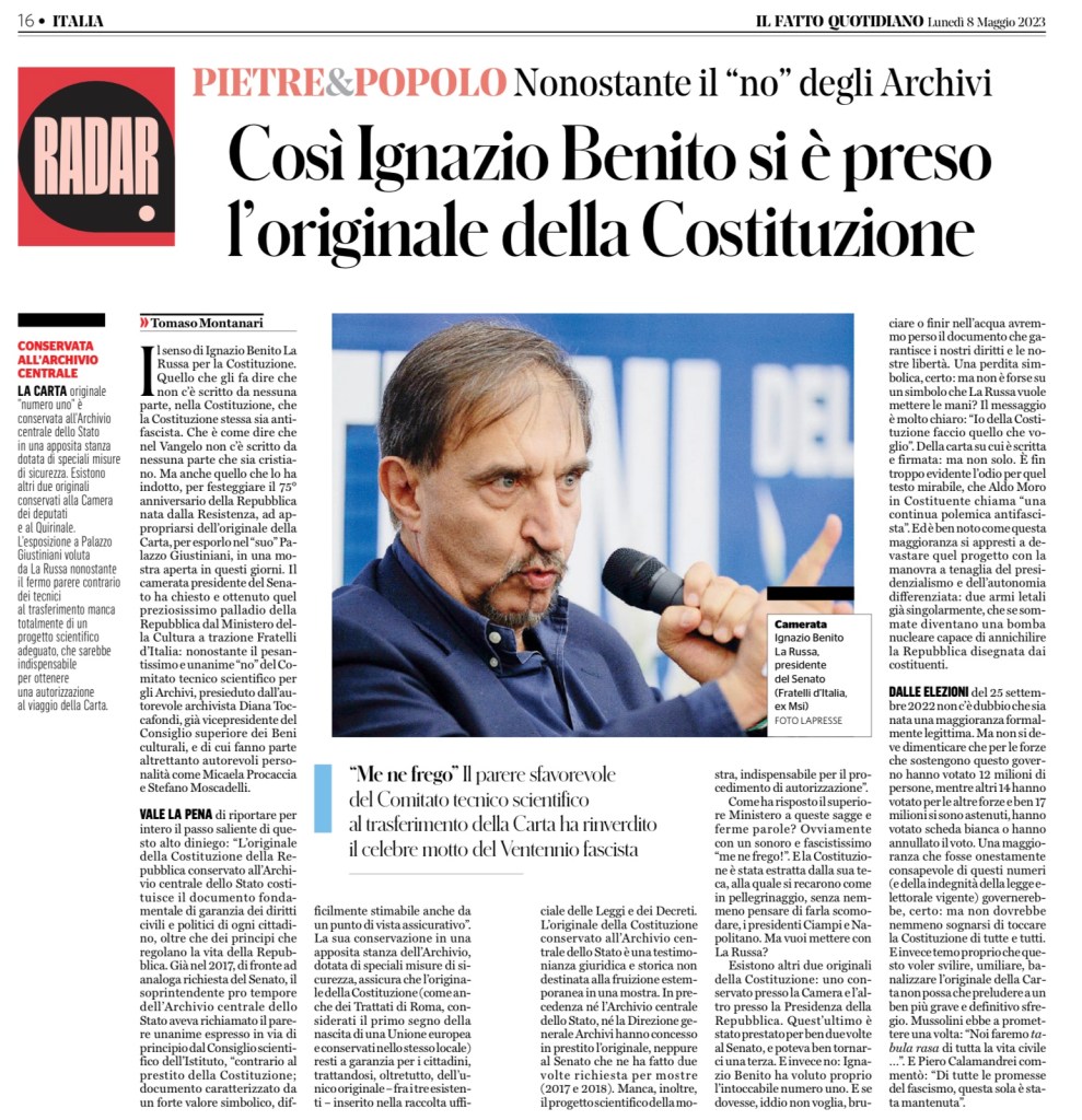 Il senso di Ignazio Benito La Russa per la Costituzione. Quello che gli fa dire che non c’è scritto da nessuna parte, nella Costituzione, che la Costituzione stessa sia antifascista. Che è come dire che nel Vangelo non c’è scritto da nessuna parte che sia cristiano. Ma anche quello che lo ha indotto, per festeggiare il 75° anniversario della Repubblica nata dalla Resistenza, ad appropriarsi dell’originale della Carta, per esporlo nel “suo” Palazzo Giustiniani, in una mostra aperta in questi giorni. Il camerata presidente del Senato ha chiesto e ottenuto quel preziosissimo palladio della Repubblica dal Ministero della Cultura a trazione Fratelli d’Italia: nonostante il pesantissimo e unanime “no” del Comitato tecnico scientifico per gli Archivi, presieduto dall’autorevole archivista Diana Toccafondi, già vicepresidente del Consiglio superiore dei Beni culturali, e di cui fanno parte altrettanto autorevoli personalità come Micaela Procaccia e Stefano Moscadelli.