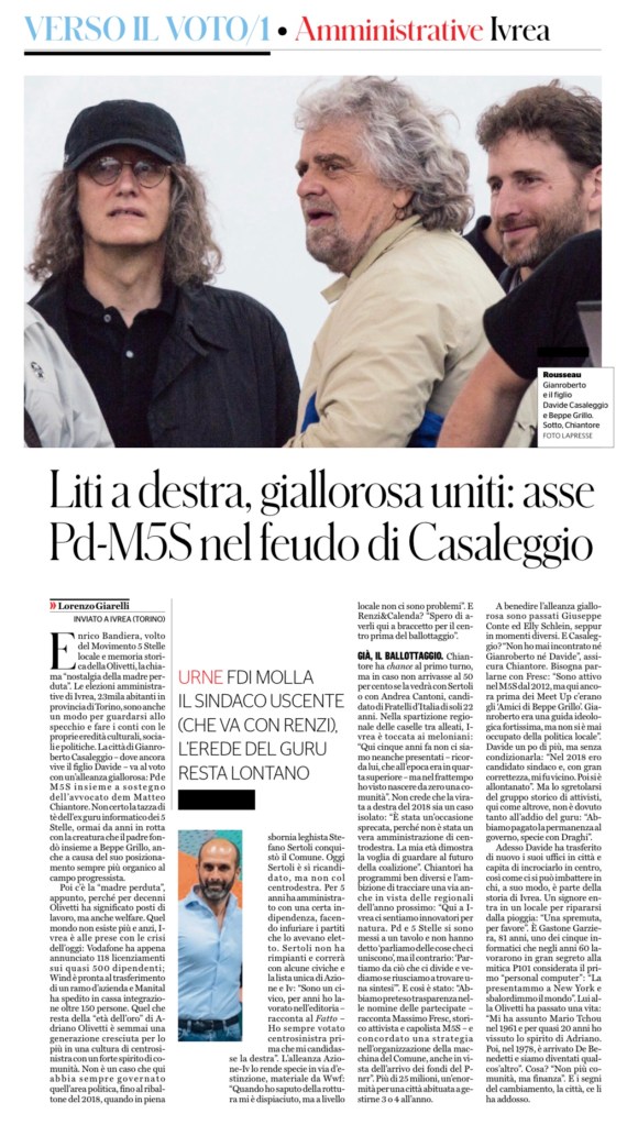 Enrico Bandiera, volto del Movimento 5 Stelle locale e memoria storica della Olivetti, la chiama “nostalgia della madre perduta”. Le elezioni amministrative di Ivrea, 23mila abitanti in provincia di Torino, sono anche un modo per guardarsi allo specchio e fare i conti con le proprie eredità culturali, sociali e politiche. La città di Gianroberto Casaleggio – dove ancora vive il figlio Davide – va al voto con un’alleanza giallorosa: Pd e M5S insieme a sostegno dell’avvocato dem Matteo Chiantore. Non certo la tazza di tè dell’ex guru informatico dei 5 Stelle, ormai da anni in rotta con la creatura che il padre fondò insieme a Beppe Grillo, anche a causa del suo posizionamento sempre più organico al campo progressista.