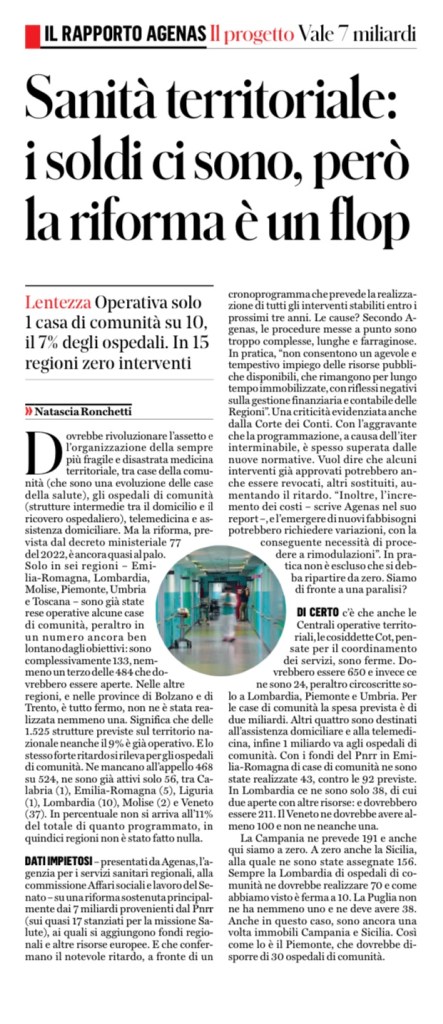 Dovrebbe rivoluzionare l’assetto e l’organizzazione della sempre più fragile e disastrata medicina territoriale, tra case della comunità (che sono una evoluzione delle case della salute), gli ospedali di comunità (strutture intermedie tra il domicilio e il ricovero ospedaliero), telemedicina e assistenza domiciliare. Ma la riforma, prevista dal decreto ministeriale 77 del 2022, è ancora quasi al palo. Solo in sei regioni – Emilia-Romagna, Lombardia, Molise, Piemonte, Umbria e Toscana – sono già state rese operative alcune case di comunità, peraltro in un numero ancora ben lontano dagli obiettivi: sono complessivamente 133, nemmeno un terzo delle 484 che dovrebbero essere aperte. Nelle altre regioni, e nelle province di Bolzano e di Trento, è tutto fermo, non ne è stata realizzata nemmeno una. Significa che delle 1.525 strutture previste sul territorio nazionale neanche il 9% è già operativo. E lo stesso forte ritardo si rileva per gli ospedali di comunità. Ne mancano all’appello 468 su 524, ne sono già attivi solo 56, tra Calabria (1), Emilia-Romagna (5), Liguria (1), Lombardia (10), Molise (2) e Veneto (37). In percentuale non si arriva all’11% del totale di quanto programmato, in quindici regioni non è stato fatto nulla.