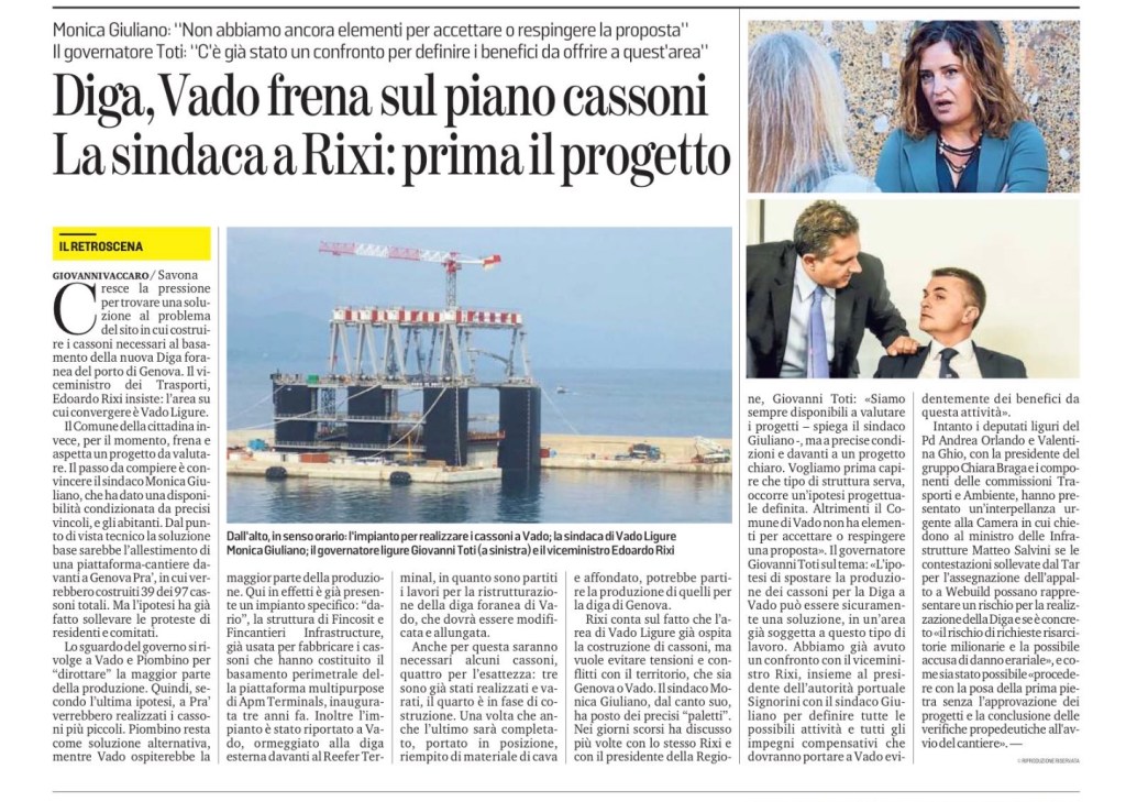 Rixi conta sul fatto che l’area di Vado Ligure già ospita la costruzione di cassoni, ma vuole evitare tensioni e conflitti con il territorio, che sia Genova o Vado. Il sindaco Monica Giuliano, dal canto suo, ha posto dei precisi “paletti”. Nei giorni scorsi ha discusso più volte con lo stesso Rixi e con il presidente della Regione, Giovanni Toti: «Siamo sempre disponibili a valutare i progetti – spiega il sindaco Giuliano -, ma a precise condizioni e davanti a un progetto chiaro. Vogliamo prima capire che tipo di struttura serva, occorre un’ipotesi progettuale definita. Altrimenti il Comune di Vado non ha elementi per accettare o respingere una proposta». Il governatore Giovanni Toti sul tema: «L’ipotesi di spostare la produzione dei cassoni per la Diga a Vado può essere sicuramente una soluzione, in un’area già soggetta a questo tipo di lavoro. Abbiamo già avuto un confronto con il viceministro Rixi, insieme al presidente dell’autorità portuale Signorini con il sindaco Giuliano per definire tutte le possibili attività e tutti gli impegni compensativi che dovranno portare a Vado evidentemente dei benefici da questa attività».
