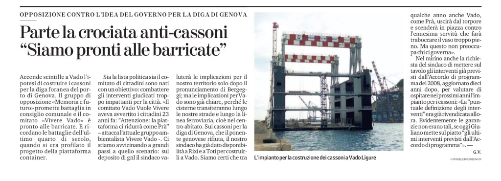 Accende scintille a Vado l’ipotesi di costruire i cassoni per la diga foranea del porto di Genova. Il gruppo di opposizione «Memoria e futuro» promette battaglia in consiglio comunale e il comitato «Vivere Vado» è pronto alle barricate. E ricordano le battaglie dell’ultimo quarto di secolo, quando si era profilato il progetto della piattaforma container.