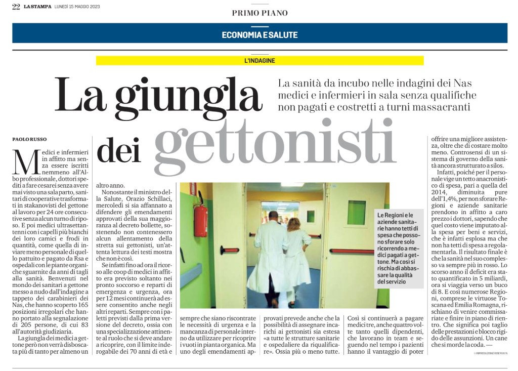 Medici e infermieri in affitto ma senza essere iscritti nemmeno all’Albo professionale, dottori spediti a fare cesarei senza avere mai visto una sala parto, sanitari di cooperative trasformati in stakanovisti del gettone al lavoro per 24 ore consecutive senza alcun turno di riposo. E poi medici ultrasettantenni con i capelli più bianchi dei loro camici e frodi in quantità, come quella di inviare meno personale di quello pattuito e pagato da Rsa e ospedali con le piante organiche sguarnite da anni di tagli alla sanità. Benvenuti nel mondo dei sanitari a gettone messo a nudo dall’indagine a tappeto dei carabinieri dei Nas, che hanno scoperto 165 posizioni irregolari che hanno portato alla segnalazione di 205 persone, di cui 83 all’autorità giudiziaria.