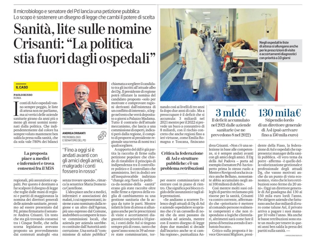 I conti di Asl e ospedali vanno sempre peggio, le liste di attesa non ne parliamo, ma ai vertici delle aziende sanitarie girano da anni più o meno gli stessi uomini nominati dalla politica. Che indipendentemente dal colore ha sempre voluto mantenere ben salda la presa sulla sanità, che da sola vale l’80% dei bilanci regionali, più assunzioni e appalti. Per questo è destinato a far scalpore il disegno di legge che toglie dalle mani di regioni e partiti di maggioranza la nomina dei direttori generali delle aziende sanitarie, prossimo ad essere presentato dal Pd, primo firmatario il senatore Andrea Crisanti. Un testo che sta già trovando consensi tra i Cinque Stelle, che nella scorsa legislatura avevano proposto un provvedimento dai contenuti analoghi «ma senza trovare sponde», rimarca la senatrice Maria Domenica Castellone.