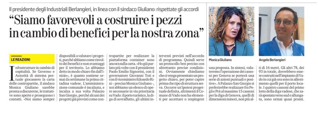 Infrastrutture in cambio di ospitalità. Se Governo e Autorità di sistema portuale giocassero la carta delle contropartite, il sindaco Monica Giuliano sarebbe pronta a discuterne, le trattative sono aperte e proseguono i contatti. «Noi siamo sempre disponibili a valutare i progetti, purché abbiano come risvolto dei benefici e non svantaggi per il territorio. Lo abbiamo detto in modo chiaro fin dall’inizio», è quanto sostiene ormai da settimane la prima cittadina vadese. L’amministrazione comunale è incalzata, e incalza a sua volta Palazzo San Giorgio, perché alcuni dei progetti già previsti come contropartite per realizzare la piattaforma container sono ancora sulla carta. «Ho già parlato più volte con il presidente Paolo Emilio Signorini, con il governatore Giovanni Toti e con il viceministro Edoardo Rixi – precisa Monica Giuliano -, noi abbiamo un elenco di opere necessarie in via prioritaria su Vado: il porto turistico, la diga di sovraflutto, gli ultimi interventi previsti nell’accordo di programma. Quindi serve un protocollo ben preciso con altrettanto precise condizioni. Ovviamente chiediamo che ci venga presentato un progetto chiaro, per poter capire prima che tipo di struttura serva. Occorre un’ipotesi progettuale definita, altrimenti il Comune di Vado non ha elementi per accettare o respingere una proposta. In sintesi, valuteremo l’operazione dei cassoni per Genova se porterà una serie di azioni puntuali e positive». A Palazzo San Giorgio si preferirebbe realizzare fra Pegli e Prà al massimo 15 cassoni per la diga di Genova, quelli di dimensioni minori, non più alti di 16 metri. Gli altri 78, dei 93 in totale, dovrebbero essere costruiti nell’impianto di Vado in cui già ora sono in allestimento quelli per il porto locale. I quattro cassoni del primo lotto della diga vadese, che sarà spostata verso sud e allungata, sono ormai quasi pronti. Sulla stessa linea del sindaco vadese anche il presidente dell’Unione Industriali, Angelo Berlangieri: «A Vado c’è già un impianto per la costruzione dei cassoni, è chiaro che sarebbe la soluzione più logica, però è bene mettere prima le condizioni precise. La struttura che oggi lavora nel porto di Vado sta realizzando i cassoni per la diga di Vado, quindi prima di tutto andrà completata questa. Finita quella vadese si potrà passare a quella di Genova, non viceversa. Inoltre bisogna sistemare la questione delle opere già previste nell’Accordo di programma ma non ancora realizzate. Ha ragione il sindaco Giuliano: l’Autorità di sistema portuale deve presentare un piano chiaro, definire i progetti non ancora realizzati qui. In pratica quell’Accordo di programma va concluso con la realizzazione delle opere previste a suo tempo, quindi bisognerà gestire nel miglior modo possibile questo nuovo capitolo. Saranno ovviamente i tecnici a stabilire il cronoprogramma, ma bisognerà partire dal presupposto che prima dovrà essere completata la nuova diga di Vado, poi si potranno costruire i cassoni di Genova. La parola “sistema” non deve essere solo un accessorio al nome dell’Autorità portuale, ma deve dare concretezza a una funzione, bisogna fare sistema, fare in modo che il porto lavori per portare vantaggi su entrambi i fronti». —