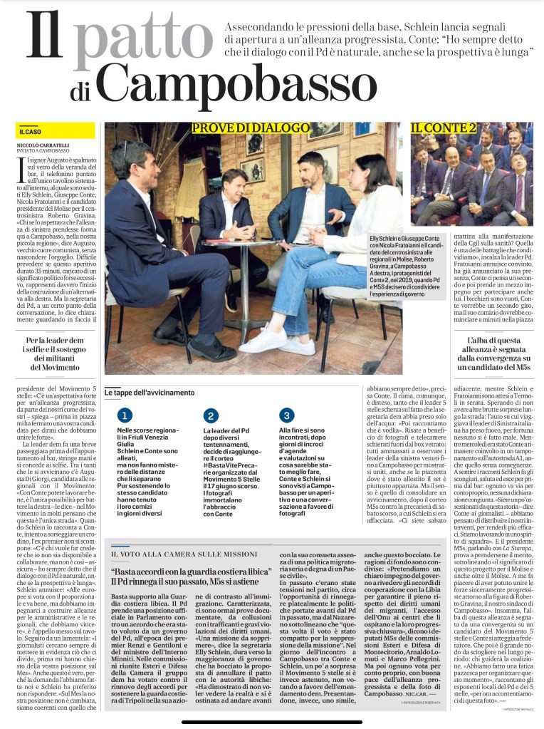 Il signor Augusto è spalmato sul vetro della veranda del bar, il telefonino puntato sull’unico tavolino sistemato all’interno, al quale sono seduti Elly Schlein, Giuseppe Conte, Nicola Fratoianni e il candidato presidente del Molise per il centrosinistra Roberto Gravina. «Chi se lo aspettava che l’alleanza di sinistra prendesse forma qui a Campobasso, nella nostra piccola regione», dice Augusto, vecchio cuore comunista, senza nascondere l’orgoglio. Difficile prevedere se questo aperitivo durato 35 minuti, caricato di un significato politico forse eccessivo, rappresenti davvero l’inizio della costruzione di un’alternativa alla destra. Ma la segretaria del Pd, a un certo punto della conversazione, lo dice chiaramente guardando in faccia il presidente del Movimento 5 stelle: «C’è un’aspettativa forte per un’alleanza progressista, da parte dei nostri come dei vostri – spiega – prima in piazza mi ha fermato una vostra candidata per dirmi che dobbiamo unire le forze».