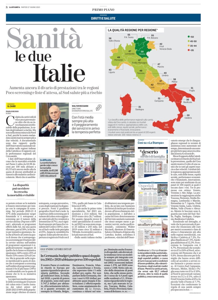 Colpita da cattivi stili di vita e poca prevenzione oltre che da un invecchiamento irrefrenabile della popolazione, la salute degli italiani è a rischio. Ma non nella stessa misura da Nord a Sud, perché la nostra malandata sanità marcia sempre più a due velocità. A documentarlo sono due rapporti: quello dell’Osservatorio nazionale sulla salute nelle regioni italiane della Cattolica e il rapporto sulle performance regionali del Crea sanità.