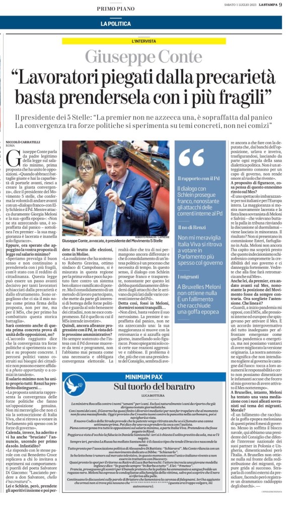 Giuseppe Conte parla da padre legittimo della legge sul salario minimo, prima proposta che ha unito le opposizioni. «Quando abbracci battaglie giuste e hai la caparbietà di portarle avanti, riesci a creare la giusta convergenza», dice il presidente del Movimento 5 stelle, che conferma la volontà di andare avanti con un «dialogo franco» con Elly Schlein e il Pd. Mentre attacca duramente Giorgia Meloni e la sua «goffa epopea»: «Non ne sta azzeccando una, è sopraffatta dal panico – sottolinea l’ex premier – la sua maggioranza è lacerata e inanella solo figuracce».