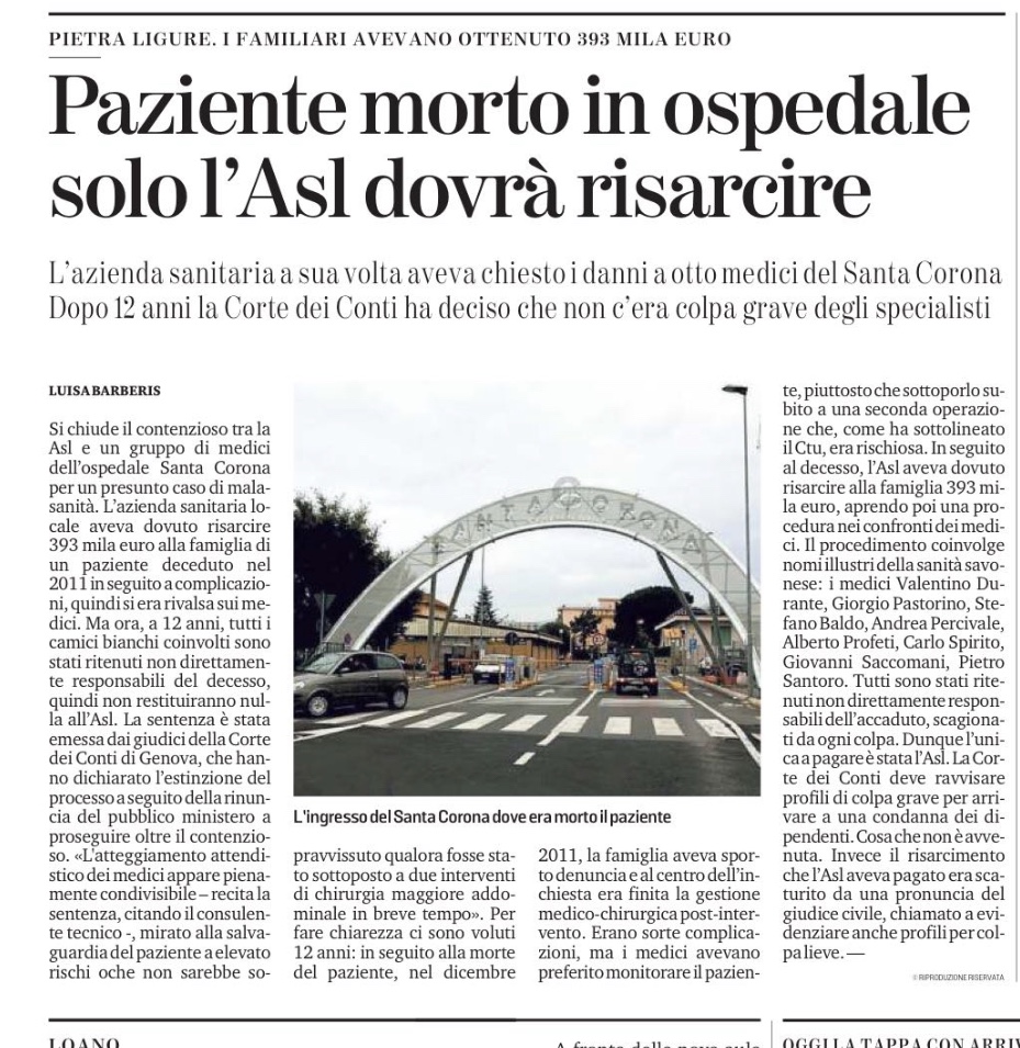 Si chiude il contenzioso tra la Asl e un gruppo di medici dell’ospedale Santa Corona per un presunto caso di malasanità. L’azienda sanitaria locale aveva dovuto risarcire 393 mila euro alla famiglia di un paziente deceduto nel 2011 in seguito a complicazioni, quindi si era rivalsa sui medici. Ma ora, a 12 anni, tutti i camici bianchi coinvolti sono stati ritenuti non direttamente responsabili del decesso, quindi non restituiranno nulla all’Asl. La sentenza è stata emessa dai giudici della Corte dei Conti di Genova, che hanno dichiarato l’estinzione del processo a seguito della rinuncia del pubblico ministero a proseguire oltre il contenzioso. «L’atteggiamento attendistico dei medici appare pienamente condivisibile – recita la sentenza, citando il consulente tecnico -, mirato alla salvaguardia del paziente a elevato rischi oche non sarebbe sopravvissuto qualora fosse stato sottoposto a due interventi di chirurgia maggiore addominale in breve tempo». Per fare chiarezza ci sono voluti 12 anni: in seguito alla morte del paziente, nel dicembre 2011, la famiglia aveva sporto denuncia e al centro dell’inchiesta era finita la gestione medico-chirurgica post-intervento. Erano sorte complicazioni, ma i medici avevano preferito monitorare il paziente, piuttosto che sottoporlo subito a una seconda operazione che, come ha sottolineato il Ctu, era rischiosa. In seguito al decesso, l’Asl aveva dovuto risarcire alla famiglia 393 mila euro, aprendo poi una procedura nei confronti dei medici. Il procedimento coinvolge nomi illustri della sanità savonese: i medici Valentino Durante, Giorgio Pastorino, Stefano Baldo, Andrea Percivale, Alberto Profeti, Carlo Spirito, Giovanni Saccomani, Pietro Santoro. Tutti sono stati ritenuti non direttamente responsabili dell’accaduto, scagionati da ogni colpa. Dunque l’unica a pagare è stata l’Asl. La Corte dei Conti deve ravvisare profili di colpa grave per arrivare a una condanna dei dipendenti. Cosa che non è avvenuta. Invece il risarcimento che l’Asl aveva pagato era scaturito da una pronuncia del giudice civile, chiamato a evidenziare anche profili per colpa lieve. —