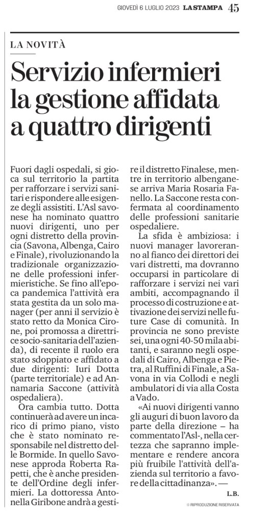 Ora cambia tutto. Dotta continuerà ad avere un incarico di primo piano, visto che è stato nominato responsabile nel distretto delle Bormide. In quello Savonese approda Roberta Rapetti, che è anche presidente dell’Ordine degli infermieri. La dottoressa Antonella Giribone andrà a gestire il distretto Finalese, mentre in territorio albenganese arriva Maria Rosaria Fanello. La Saccone resta confermata al coordinamento delle professioni sanitarie ospedaliere.