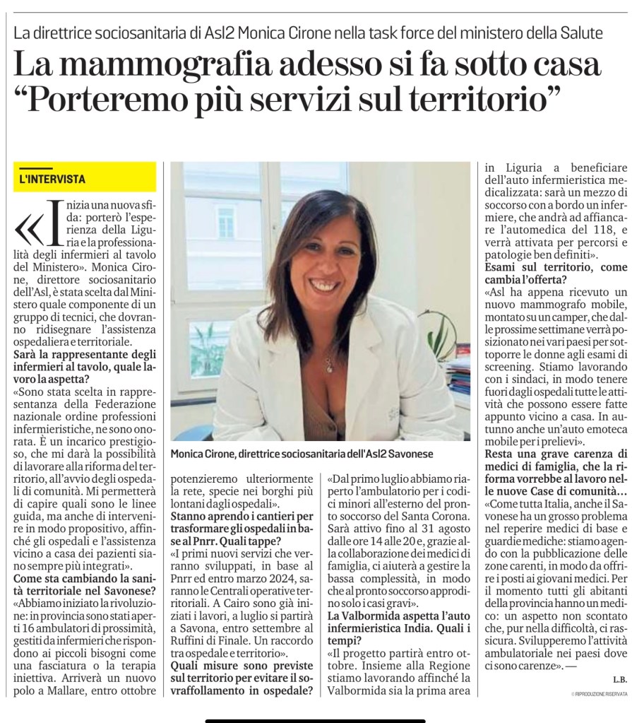 «Inizia una nuova sfida: porterò l’esperienza della Liguria e la professionalità degli infermieri al tavolo del Ministero». Monica Cirone, direttore sociosanitario dell’Asl, è stata scelta dal Ministero quale componente di un gruppo di tecnici, che dovranno ridisegnare l’assistenza ospedaliera e territoriale.