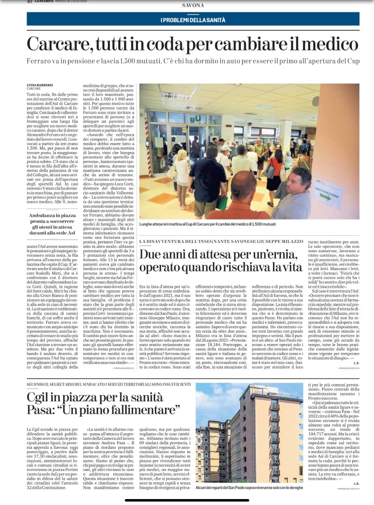 Tutti in coda, fin dalle prime ore del mattino al Centro prenotazioni dell’Asl di Carcare per cambiare il medico di famiglia. Centinaia di valbormidesi si sono ritrovati ieri a fronteggiare una lunga fila per scegliere un nuovo medico curante, dopo che il dottor Alessandro Ferraro si è congedato dal lavoro venerdì. I convocati a partire da ieri erano 1.500. Ma, per paura di non trovare posto, la maggioranza ha deciso di effettuare la pratica subito. C’è stato chi si è messo in fila dall’alba all’esterno della palazzina di via del Collegio, alcuni sono arrivati ore prima dell’apertura degli sportelli Asl. In casi estremi c’è stato chi ha dormito in macchina, pur di passare per primo e poter scegliere un nuovo medico. Alle 9, nonostante l’Asl avesse aumentato le postazioni e gli impiegati lavorassero senza sosta, la fila arrivava all’esterno della palazzina che ospita il Cup. E’ arrivato anche il sindaco di Carcare Rodolfo Mirri, che si è confrontato con il direttore del distretto valbormidese Luca Corti. Quindi, in ragione del forte caldo, Mirri ha chiesto alla Croce Bianca di posizionare un equipaggio davanti alla sede in caso di necessità. La situazione è emblematica della carenza di camici bianchi, di cui soffre anche il territorio: Ferraro aveva comunicato con ampio anticipo il pensionamento, anzi ha accettato di restare in studio più tempo del previsto, affinché l’Asl riuscisse a trovare un sostituto. Ma per due volte il bando è andato deserto, di conseguenza l’Asl ha optato per spalmare i pazienti a carico degli altri colleghi della medicina di gruppo, che si sono resi disponibili ad aumentare il loro massimale, passando da 1.500 a 1.900 assistiti. Per questo motivo tutte le 1.500 persone curate da Ferraro sono state invitate a presentarsi di persona (o a delegare un parente) agli sportelli per scegliere un nuovo dottore a partire da ieri.