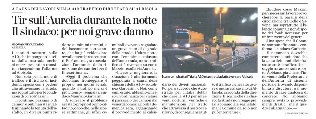 I cantieri notturni sulla A10, che impongono l’uscita dall’autostrada anche ai mezzi pesanti in transito, riaccendono l’allarme ad Albisola.