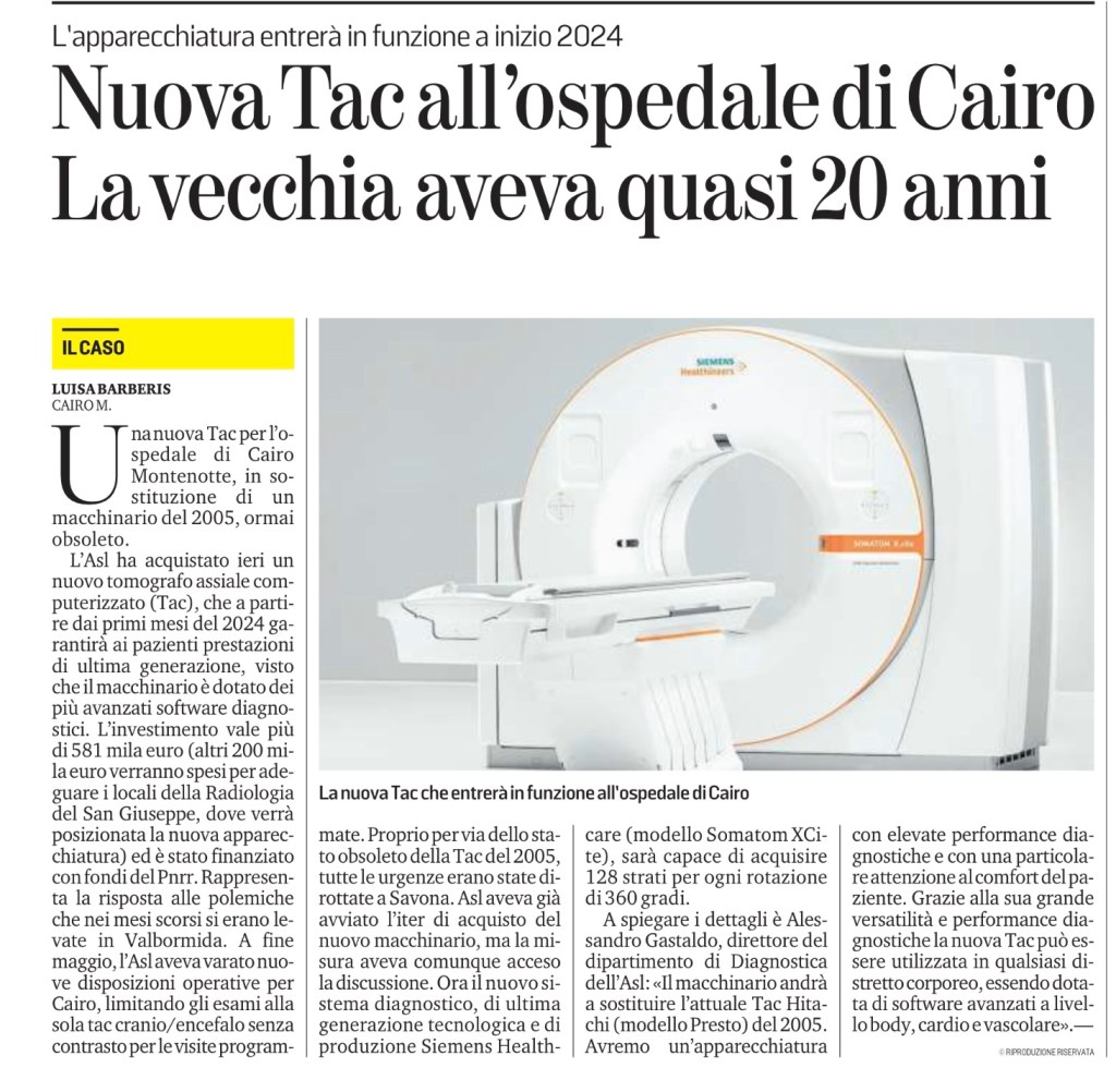 L’Asl ha acquistato ieri un nuovo tomografo assiale computerizzato (Tac), che a partire dai primi mesi del 2024 garantirà ai pazienti prestazioni di ultima generazione, visto che il macchinario è dotato dei più avanzati software diagnostici. L’investimento vale più di 581 mila euro (altri 200 mila euro verranno spesi per adeguare i locali della Radiologia del San Giuseppe, dove verrà posizionata la nuova apparecchiatura) ed è stato finanziato con fondi del Pnrr. Rappresenta la risposta alle polemiche che nei mesi scorsi si erano levate in Valbormida. A fine maggio, l’Asl aveva varato nuove disposizioni operative per Cairo, limitando gli esami alla sola tac cranio/encefalo senza contrasto per le visite programmate. Proprio per via dello stato obsoleto della Tac del 2005, tutte le urgenze erano state dirottate a Savona. Asl aveva già avviato l’iter di acquisto del nuovo macchinario, ma la misura aveva comunque acceso la discussione. Ora il nuovo sistema diagnostico, di ultima generazione tecnologica e di produzione Siemens Healthcare (modello Somatom XCite), sarà capace di acquisire 128 strati per ogni rotazione di 360 gradi.