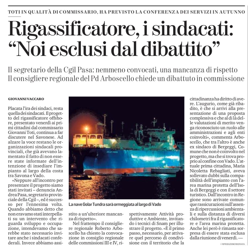 Placata l’ira dei sindaci, resta quella dei sindacati. Il progetto del rigassificatore offshore, presentato venerdì ai primi cittadini dal commissario Giovanni Toti, continua a far discutere nel Savonese. Ad alzare la voce restano le organizzazioni sindacali provinciali, che già avevano lamentato il fatto di non essere state informate dell’intenzione di insediare l’impianto al largo della costa tra Savona e Vado.