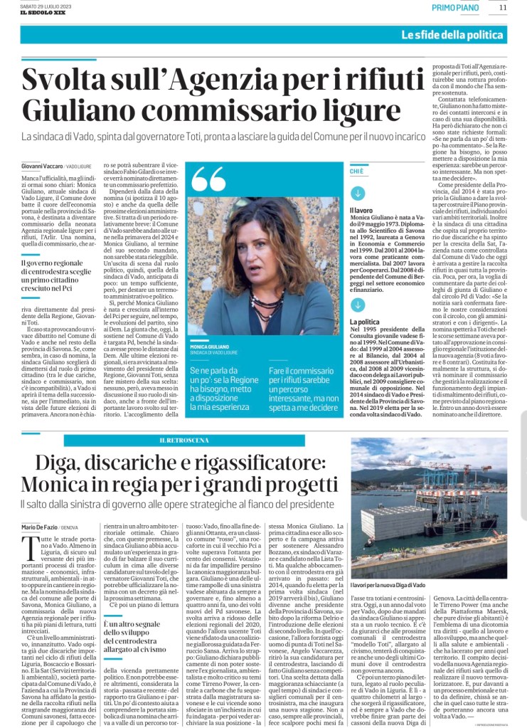 La notizia si è diffusa ieri e ha creato uno scossone nel mondo amministrativo e politico savonese: Monica Giuliano, sindaco di Vado Ligure, sarebbe destinata a diventare commissario della neonata agenzia regionale Ligure per i rifiuti, l’Arlilr. Se sarà così e se, come pare da indiscrezioni, Giuliano sceglierà di dimettersi, l’amministrazione di Vado potrebbe decadere e potrebbe essere nominato un commissario prefettizio, sino alle elezioni del 2024 a cui Giuliano, al secondo mandato, non avrebbe potuto candidarsi.
