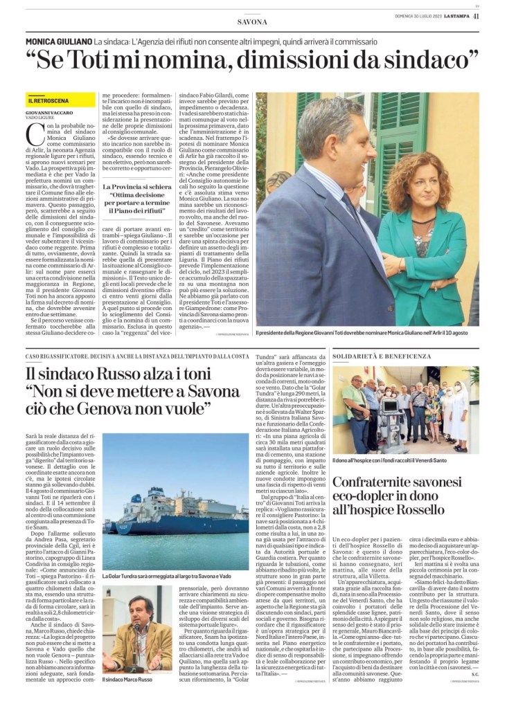 «Se dovesse arrivare questo incarico non sarebbe incompatibile con il ruolo di sindaco, essendo tecnico e non elettivo, però non sarebbe corretto e opportuno cercare di portare avanti entrambi – spiega Giuliano -. Il lavoro di commissario per i rifiuti è complesso e totalizzante. Quindi la strada sarebbe quella di presentare la situazione al Consiglio comunale e rassegnare le dimissioni». Il Testo unico degli enti locali prevede che le dimissioni diventino efficaci entro venti giorni dalla presentazione al Consiglio. A quel punto si procede con lo scioglimento del Consiglio e la nomina di un commissario. Esclusa in questo caso la “reggenza” del vicesindaco Fabio Gilardi, come invece sarebbe previsto per impedimento o decadenza. I vadesi sarebbero stati chiamati comunque al voto nella prossima primavera, dato che l’amministrazione è in scadenza. Nel frattempo l’ipotesi di nominare Monica Giuliano come commissario di Arlir ha già raccolto il sostegno del presidente della Provincia, Pierangelo Olivieri: «Anche come presidente del Consiglio autonomie locali ho seguito la questione e c’è assoluta stima verso Monica Giuliano. La sua nomina sarebbe un riconoscimento dei risultati del lavoro svolto, ma anche del ruolo del Savonese. Avevamo un “credito” come territorio e sarebbe un’occasione per dare una spinta decisiva per definire un assetto degli impianti di trattamento della Liguria. Il Piano dei rifiuti prevede l’implementazione del ciclo, nel 2023 il semplice accumulo della spazzatura su una montagna non può più essere la soluzione. Ne abbiamo già parlato con il presidente Toti e l’assessore Giampedrone: come Provincia di Savona siamo pronti a coordinarci con la nuova agenzia». —