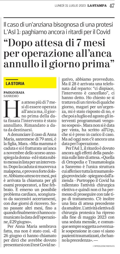 Dopo attesa di 7 mesi per operazione all’anca annullo il giorno prima