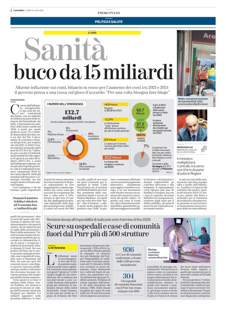 Ma la stangata più grossa arriverà con il rinnovo del contratto 2022-24, quello che deve recuperare le quote di retribuzione divorate dall’inflazione e senza il quale i sindacati di categoria, compresi quelli del restante personale sanitario, promettono scioperi a rischio paralisi di Asl e ospedali. Quanto verrà stanziato non è dato sapere, ma una cosa è chiara: anche in questo caso i numeri del fondo sanitario dovranno essere rivisti all’insù per un pari importo perché altrimenti ci troveremmo di fronte a un taglio nemmeno troppo occulto.