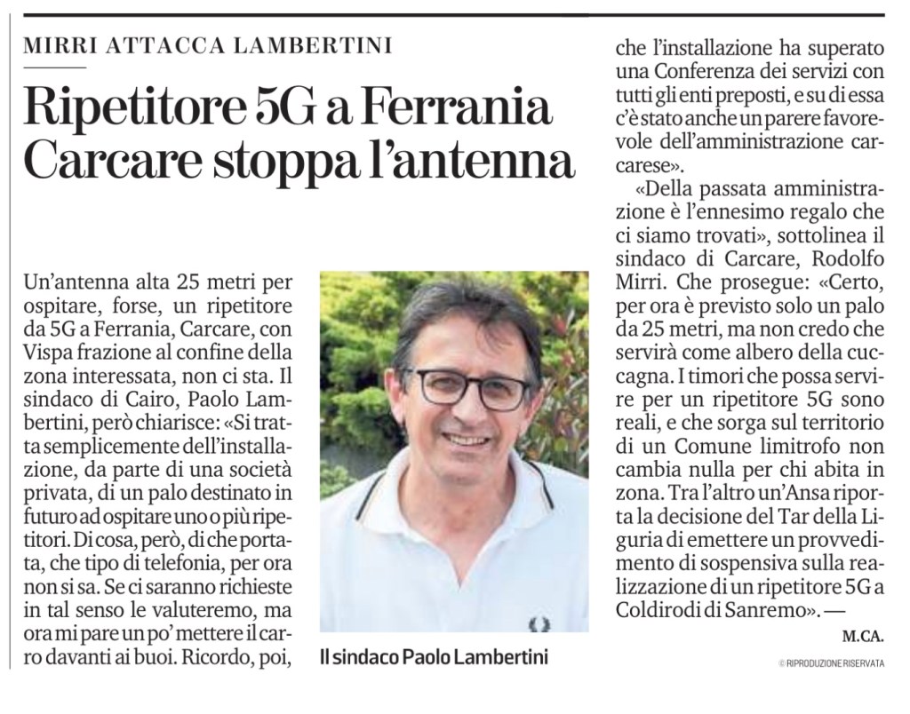 «Della passata amministrazione è l’ennesimo regalo che ci siamo trovati», sottolinea il sindaco di Carcare, Rodolfo Mirri. Che prosegue: «Certo, per ora è previsto solo un palo da 25 metri, ma non credo che servirà come albero della cuccagna. I timori che possa servire per un ripetitore 5G sono reali, e che sorga sul territorio di un Comune limitrofo non cambia nulla per chi abita in zona. Tra l’altro un’Ansa riporta la decisione del Tar della Liguria di emettere un provvedimento di sospensiva sulla realizzazione di un ripetitore 5G a Coldirodi di Sanremo». —