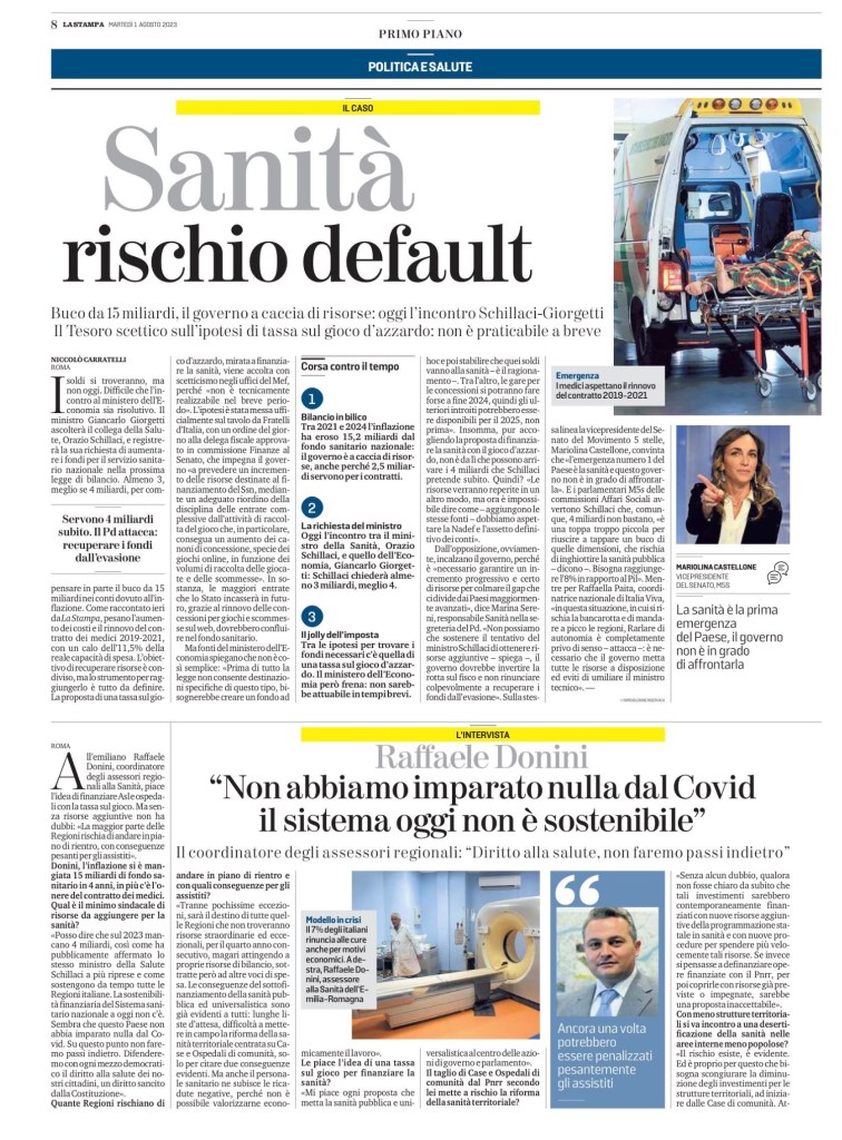 I soldi si troveranno, ma non oggi. Difficile che l’incontro al ministero dell’Economia sia risolutivo. Il ministro Giancarlo Giorgetti ascolterà il collega della Salute, Orazio Schillaci, e registrerà la sua richiesta di aumentare i fondi per il servizio sanitario nazionale nella prossima legge di bilancio. Almeno 3, meglio se 4 miliardi, per compensare in parte il buco da 15 miliardi nei conti dovuto all’inflazione. Come raccontato ieri da La Stampa, pesano l’aumento dei costi e il rinnovo del contratto dei medici 2019-2021, con un calo dell’11,5% della reale capacità di spesa. L’obiettivo di recuperare risorse è condiviso, ma lo strumento per raggiungerlo è tutto da definire. La proposta di una tassa sul gioco d’azzardo, mirata a finanziare la sanità, viene accolta con scetticismo negli uffici del Mef, perché «non è tecnicamente realizzabile nel breve periodo». L’ipotesi è stata messa ufficialmente sul tavolo da Fratelli d’Italia, con un ordine del giorno alla delega fiscale approvato in commissione Finanze al Senato, che impegna il governo «a prevedere un incremento delle risorse destinate al finanziamento del Ssn, mediante un adeguato riordino della disciplina delle entrate complessive dall’attività di raccolta del gioco che, in particolare, consegua un aumento dei canoni di concessione, specie dei giochi online, in funzione dei volumi di raccolta delle giocate e delle scommesse». In sostanza, le maggiori entrate che lo Stato incasserà in futuro, grazie al rinnovo delle concessioni per giochi e scommesse sul web, dovrebbero confluire nel fondo sanitario.