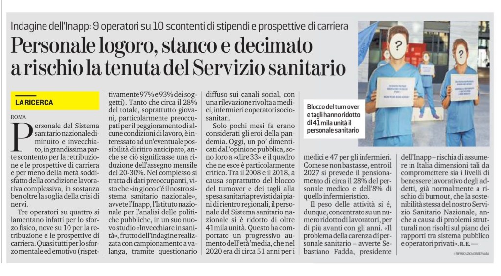 Il peso delle attività si é, dunque, concentrato su un numero ridotto di lavoratori, per di più avanti con gli anni. «Il problema della carenza di personale sanitario – avverte Sebastiano Fadda, presidente dell’Inapp – rischia di assumere in Italia dimensioni tali da compromettere sia i livelli di benessere lavorativo degli addetti, già normalmente a rischio di burnout, che la sostenibilità stessa del nostro Servizio Sanitario Nazionale, anche a causa di problemi strutturali non risolti sul piano dei rapporti tra sistema pubblico e operatori privati». R. E. —
