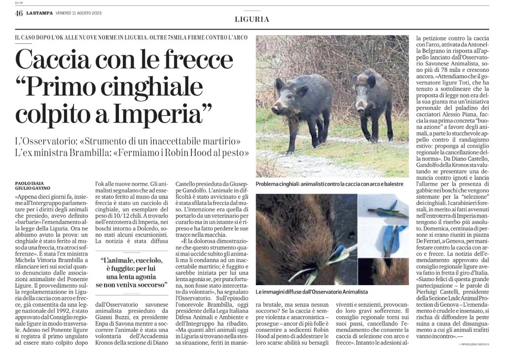 «È la dolorosa dimostrazione che questo strumento quasi mai uccide subito gli animali ma li condanna ad un inaccettabile martirio; è fuggito e sarebbe iniziata per lui una lenta agonia se, per pura fortuna, non fosse stato intercettato da volontari», ha segnalato l’Osservatorio. Sull’episodio l’onorevole Brambilla, oggi presidente della Lega Italiana Difesa Animali e Ambiente e dell’Integruppo ha ribadito. «Ma quanti altri animali oggi in Liguria si trovano nella stessa situazione, feriti in maniera brutale, ma senza nessun soccorso? Se la caccia è sempre violenta e anacronistica – prosegue – ancor di più folle è consentire a sedicenti Robin Hood al pesto di addestrare le loro scarse abilità su bersagli viventi e senzienti, provocando loro gravi sofferenze. Il consiglio regionale torni sui suoi passi, cancellando l’emendamento che consente la caccia di selezione con arco e frecce». Intanto le adesioni alla petizione contro la caccia con l’arco, attivata da Antonella Belgrano in risposta all’appello lanciato dall’Osservatorio Savonese Animalista, sono più di 78 mila e crescono ancora. «Attendiamo che il governatore ligure Toti, che ha tenuto a sottolineare che la proposta di legge non era della sua giunta ma un’iniziativa personale del paladino dei cacciatori Alessio Piana, faccia la sua prima concreta “buona azione” a favore degli animali, a parte lo stucchevole appello contro il randagismo estivo: proponga al consiglio regionale la cancellazione della norma». Da Diano Castello, Gandolfo della Kronos sta valutando se presentare una denuncia contro ignoti e lancia l’allarme per la presenza di gabbie nei boschi che vengono sistemate per la “selezione” dei cinghiali. I carabinieri forestali, in merito ai fatti avvenuti nell’entroterra di Imperia mantengono il riserbo più assoluto. Domenica, centinaia di persone si erano riuniti in piazza De Ferrari, a Genova, per manifestare contro la caccia con arco e frecce. La notizia dell’emendamento approvato dal consiglio regionale ligure aveva fatto in fretta il giro d’Italia. «Siamo felici di questa grande partecipazione – le parole di Pierluigi Castelli, presidente della Sezione Lndc Animal Protection di Genova – L’emendamento è crudele e insensato, si rischia di diffondere la peste suina a causa del dissanguamento a cui gli animali trafitti vanno incontro».—