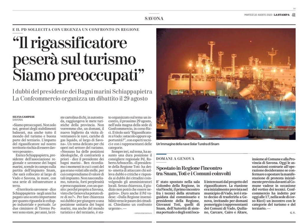 «Il territorio savonese – dice Schiappapietra- negli anni ha pagato uno scotto importante per quanto riguarda lo sviluppo industriale e portuale. Le due ciminiere di Tirreno Power sono state, per anni, la triste cartolina di chi, in autostrada, raggiungeva le mete turistiche della provincia. Non vorremmo che, un domani, il nuovo biglietto da visita diventassero le navi, cariche di gas liquido, al largo di Savona». Un tema delicato per chi operi nel settore del turismo. «Nessuno ha delle posizioni ideologiche, di contrarietà a priori – dice il presidente dei bagni marini-. Ben ricordiamo i momenti in cui i costi del gas erano volati alle stelle, per cui comprendiamo il valore di tali impianto. Non nascondiamo, tuttavia, forti perplessità e preoccupazione, con un quesito: perché proprio a Savona, visto che Genova ha potuto dire di no?». Per fare chiarezza sui dubbi e per giungere a una posizione unitaria dei bagni marini, ma anche del mondo turistico e del terziario, è stato organizzato sul tema un incontro, il prossimo 29 agosto, nell’aula magna della sede di Confcommercio, in corso Ricci. Il titolo sarà “Rigassificatore a Vado: ostacolo oppure opportunità?”, con esperti tecnici e con i rappresentanti delle categorie.