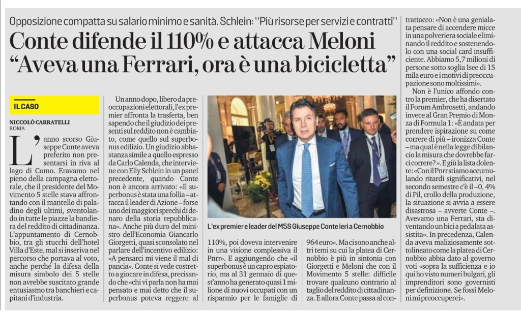 Non è l’unico affondo contro la premier, che ha disertato il Forum Ambrosetti, andando invece al Gran Premio di Monza di Formula 1: «È andata per prendere ispirazione su come correre di più – ironizza Conte – ma qual è nella legge di bilancio la misura che dovrebbe farci correre? ». E giù la lista dolente: «Con il Pnrr stiamo accumulando ritardi significativi, nel secondo semestre c’è il –0, 4% di Pil, crollo della produzione, la situazione si avvia a essere disastrosa – avverte Conte –. Avevamo una Ferrari, sta diventando un bici a pedalata assistita». In precedenza, Calenda aveva maliziosamente sottolineato come la platea di Cernobbio abbia dato al governo voti «sopra la sufficienza e io qui ho visto numeri bulgari, gli imprenditori sono governisti per definizione. Se fossi Meloni mi preoccuperei».