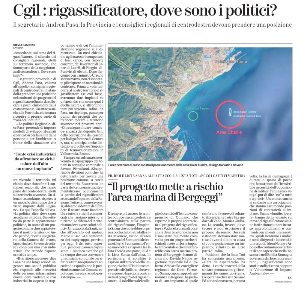 Il segretario provinciale di Cgil, Andrea Pasa, chiama all’appello i consiglieri regionali di centrodestra, invitandoli a prendere una posizione nei confronti del progetto del rigassificatore Snam, da collocare a pochi chilometri dalla costa savonese. Un attacco anche alla Provincia, chiamata a ricoprire il proprio ruolo di “casa dei Comuni”.