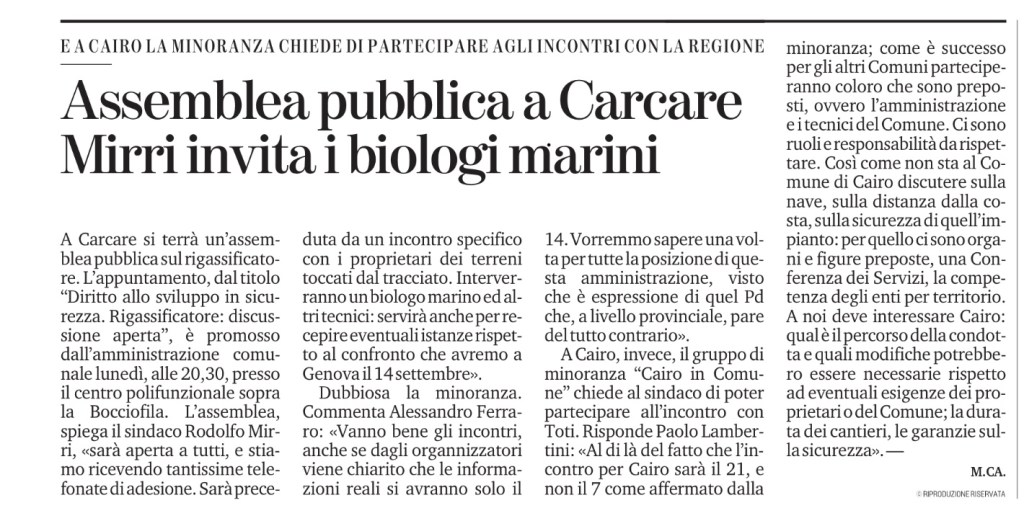 A Carcare si terrà un’assemblea pubblica sul rigassificatore. L’appuntamento, dal titolo “Diritto allo sviluppo in sicurezza. Rigassificatore: discussione aperta”, è promosso dall’amministrazione comunale lunedì, alle 20,30, presso il centro polifunzionale sopra la Bocciofila. L’assemblea, spiega il sindaco Rodolfo Mirri, «sarà aperta a tutti, e stiamo ricevendo tantissime telefonate di adesione. Sarà preceduta da un incontro specifico con i proprietari dei terreni toccati dal tracciato. Interverranno un biologo marino ed altri tecnici: servirà anche per recepire eventuali istanze rispetto al confronto che avremo a Genova il 14 settembre».