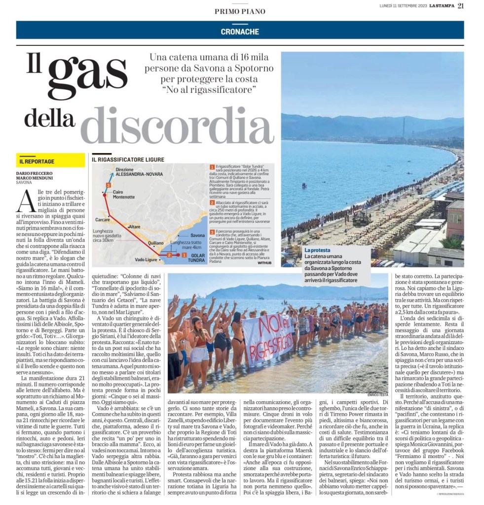 Alle tre del pomeriggio in punto i fischietti iniziano a trillare e migliaia di persone si riversano in spiaggia quasi all’improvviso. Fino a venti minuti prima sembrava non ci fosse nessuno eppure in pochi minuti la folla diventa un’onda che si contrappone alla risacca come una diga. “Difendiamo il nostro mare”, è lo slogan che guida la catena umana contro il rigassificatore. Le mani battono a un ritmo regolare. Qualcuno intona l’inno di Mameli. «Siamo in 16 mila!», è il commento entusiasta degli organizzatori. La battigia di Savona è presidiata da una doppia fila di persone con i piedi a filo d’acqua. Si replica a Vado. Affollatissimi i lidi delle Albisole, Spotorno e di Bergeggi. Parte un grido: «Toti, Toti v…». Gli organizzatori lo bloccano subito: «Le regole sono chiare: niente insulti. Toti ci ha dato dei terrapiattisti, ma se rispondiamo così il livello scende e questo non serve a nessuno».
