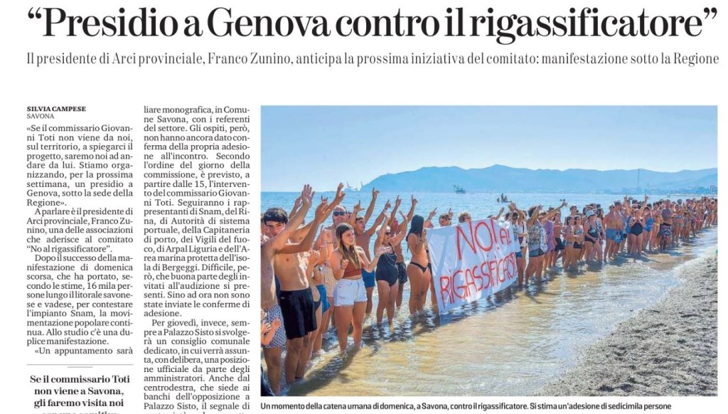 Dopo il successo della manifestazione di domenica scorsa, che ha portato, secondo le stime, 16 mila persone lungo il litorale savonese e vadese, per contestare l’impianto Snam, la movimentazione popolare continua. Allo studio c’è una duplice manifestazione.