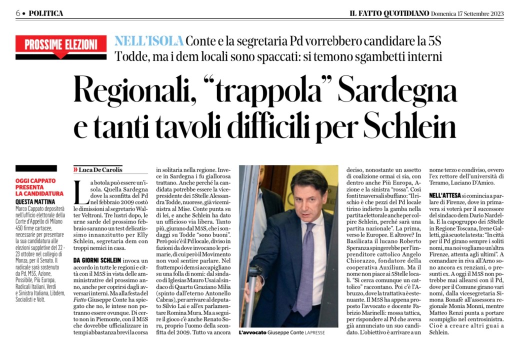 La botola può essere un’isola. Quella Sardegna dove la sconfitta del Pd nel febbraio 2009 costò le dimissioni al segretario Walter Veltroni. Tre lustri dopo, le urne sarde del prossimo febbraio saranno un test delicatissimo innanzitutto per Elly Schlein, segretaria dem con troppi nemici in casa.