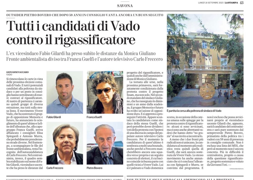 La tornata alle urne, nella prossima primavera, sarà forzatamente condizionata dalla protesta contro il progetto Snam, ma non solo. Nel secondo mandato del sindaco Giuliano, che ha rassegnato le dimissioni a un anno dalla scadenza, il gruppo Memoria e futuro ha svolto un’azione di opposizione dura. E si appresta a proseguire l’attività. Appare scontata la candidatura come sindaco della stessa Guelfi, che però potrebbe dover dividere i voti della protesta con l’ipotesi di una discesa in campo del popolare autore televisivo Carlo Freccero. Per il momento la candidatura di quest’ultimo è sembrata a molti una boutade, anche perché a Freccero mancherebbero ancora una squadra vera e propria e un seguito concreto di elettori, il cui bacino coincide in buona parte con quelli vicini a Vivere Vado. Lui si è palesato a Vado domenica scorsa, in occasione della catena umana sulle spiagge per la protesta contro il rigassificatore: alcuni si sono avvicinati, ma ci sono anche altrettanti vadesi che hanno detto “no grazie” al suo invito a incontrarlo.