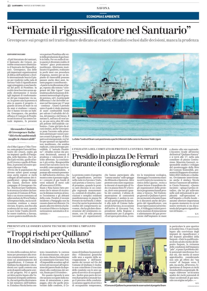 «Il più bistrattato dei santuari, il Santuario dei Cetacei, potrebbe ormai essere ribattezzato il Santuario dei Rigassificatori». Greenpeace, una delle più importanti organizzazioni di difesa dell’ambiente a livello internazionale boccia il piano per trasferire nella rada di Savona-Vado il rigassificatore oggi ormeggiato a una banchina del porto di Piombino. In realtà viene bocciato senza appello direttamente il ricorso agli impianti di trasformazione del gas trasportato via nave. In questo caso la protesta si alza in quanto il progetto riguarda un’area di mare in cui da anni si studiano i cetacei, che vi hanno trovato un habitat. Greenpeace, che peraltro affianca il Comune di Piombino nel ricorso al Tar contro l’attuale impianto, fa presente che il Mar Ligure e l’Alto Tirreno, ossia proprio l’area del Santuario dei cetacei, ospita già tre impianti: quello di Panigaglia, nello Spezzino, che è anche il più vecchio, quello al largo di Livorno e quello di Piombino, in procinto di essere spostato a Savona-Vado.