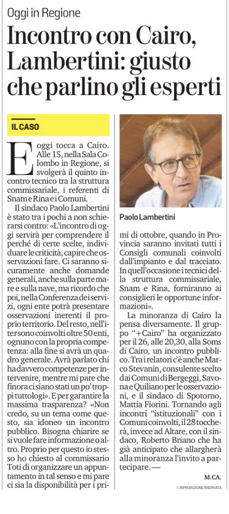 La minoranza di Cairo la pensa diversamente. Il gruppo “+Cairo” ha organizzato per il 26, alle 20,30, alla Soms di Cairo, un incontro pubblico. Tra i relatori c’è anche Marco Stevanin, consulente scelto dai Comuni di Bergeggi, Savona e Quiliano per le osservazioni, e il sindaco di Spotorno, Mattia Fiorini. Tornando agli incontri “istituzionali” con i Comuni coinvolti, il 28 toccherà, invece ad Altare, con il sindaco, Roberto Briano che ha già anticipato che allargherà alla minoranza l’invito a partecipare. —