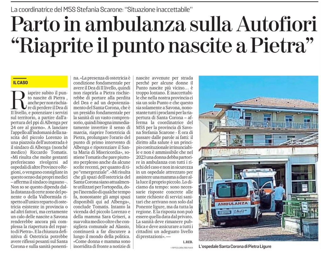 Riaprire subito il punto nascite di Pietra , anche per non rischiare di perdere il Dea di II livello, e potenziare i servizi sul territorio, a partire dall’apertura del ppi di Albenga per 24 ore al giorno». A lanciare l’appello all’indomani della nascita del piccolo Lorenzo in una piazzola dell’autostrada è il sindaco di Albenga (nonché medico) Riccardo Tomatis. «Mi risulta che molte gestanti preferiscano rivolgersi ad ospedali di altre Province o Regioni, o vengano consigliate in questo senso dai propri medici – afferma il sindaco ingauno -. Non so se questo dipenda dalla distanza di certe zone del ponente o della Valbormida rispetto all’unico reparto di ostetricia esistente in provincia o ad altri fattori, ma certamente un calo delle nascite a Savona renderebbe ancora più complessa la riapertura del reparto di Pietra». E la chiusura definitiva di Ostetricia potrebbe avere riflessi pesanti sul Santa Corona e sulla sanità ponentina. «La presenza di ostetricia è condizione fondamentale per avere il Dea di II livello, quindi non riaprirla a Pietra rischierebbe di portare alla perdita del Dea e ad un depotenziamento del Santa Corona, che è un presidio fondamentale per la sanità di un vasto comprensorio, quindi bisogna immediatamente invertire il senso di marcia, riaprire l’ostetricia di Pietra, prolungare l’orario del punto di primo intervento di Albenga e ripotenziare il Santa Maria di Misericordia», sostiene Tomatis che pare piuttosto perplesso anche da alcune scelte recenti, per quanto di tipo “emergenziale”. «Mi risulta che gli spazi dell’ostetricia del Santa Corona siano attualmente utilizzati per l’ortopedia, dopo l’incendio di qualche tempo fa, nonostante gli ampi spazi disponibili qui ad Albenga», conclude Tomatis. Intanto la vicenda del piccolo Lorenzo e della mamma Sara Griseri, a sua volta medico oltre che consigliera comunale ad Alassio, continuerà a far discutere a lungo il mondo della politica. «Come donna e mamma sono inorridita di fronte a notizie di nascite avvenute per strada perché per alcune donne il Punto nascite più vicino… è troppo lontano. È inaccettabile che nella nostra provincia ci sia un solo Punto e che questo sia solamente a Savona, nonostante tutti i proclami per la riapertura di Santa Corona – afferma la coordinatrice del M5S per la provincia di Savona Stefania Scarone – È ora di passare dalle parole ai fatti: il diritto alla salute è un principio costituzionale irrinunciabile e non è ammissibile che nel 2023 una donna debba partorire in ambulanza con tutti i rischi del caso e non in sicurezza in un ospedale attrezzato per assistere una mamma a dare alla luce il proprio piccolo. Lo diciamo da tempo: sono necessarie risposte concrete alle tante richieste di servizi sanitari che arrivano non solo dal Ponente ligure, ma da tutta la regione. E la risposta non può essere quella data dal privato. La sanità deve rimanere pubblica e deve assicurare a tutti i cittadini un adeguato livello di prestazioni». —