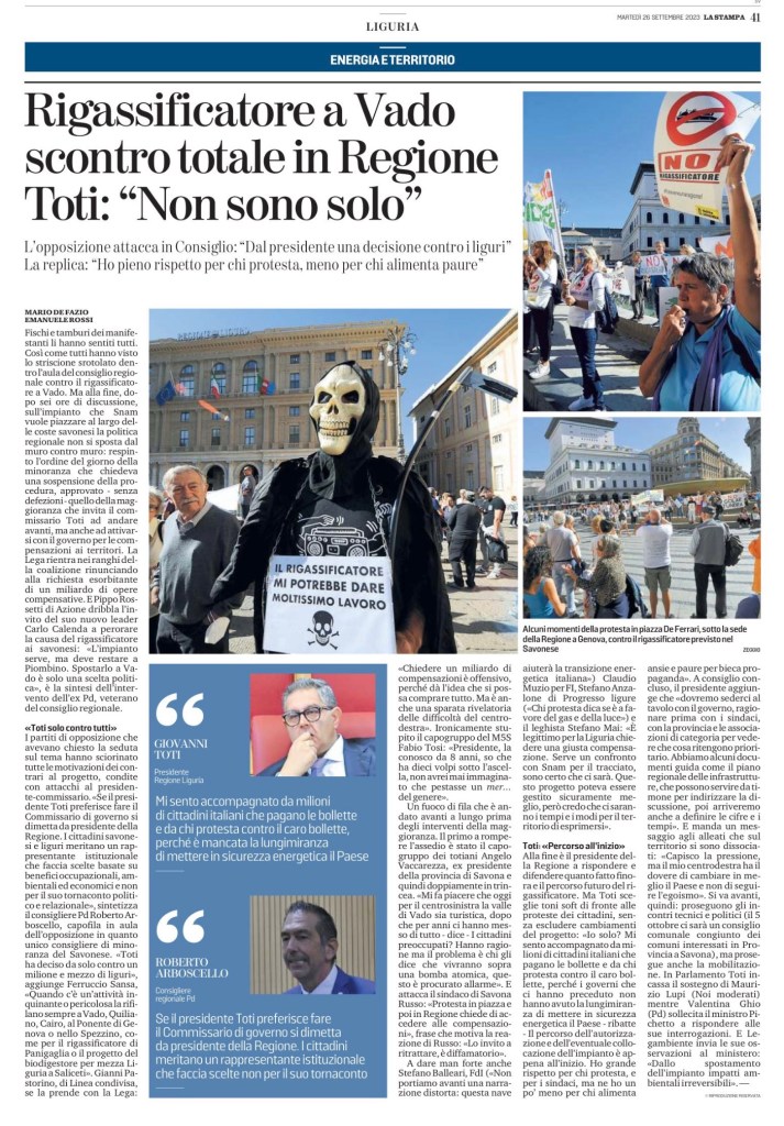 A dare man forte anche Stefano Balleari, FdI («Non portiamo avanti una narrazione distorta: questa nave aiuterà la transizione energetica italiana») Claudio Muzio per FI, Stefano Anzalone di Progresso ligure («Chi protesta dica se è a favore del gas e della luce») e il leghista Stefano Mai: «È legittimo per la Liguria chiedere una giusta compensazione. Serve un confronto con Snam per il tracciato, sono certo che ci sarà. Questo progetto poteva essere gestito sicuramente meglio, però credo che ci saranno i tempi e i modi per il territorio di esprimersi».