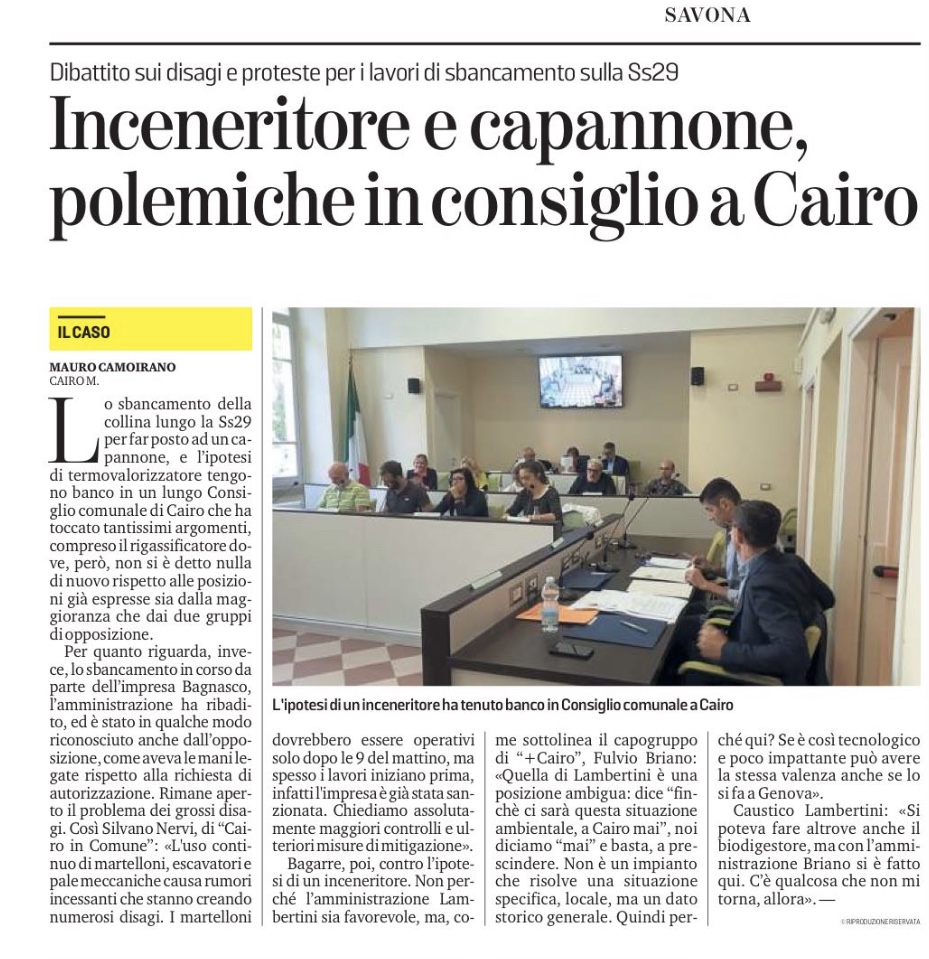 Bagarre, poi, contro l’ipotesi di un inceneritore. Non perché l’amministrazione Lambertini sia favorevole, ma, come sottolinea il capogruppo di “+Cairo”, Fulvio Briano: «Quella di Lambertini è una posizione ambigua: dice “finchè ci sarà questa situazione ambientale, a Cairo mai”, noi diciamo “mai” e basta, a prescindere. Non è un impianto che risolve una situazione specifica, locale, ma un dato storico generale. Quindi perché qui? Se è così tecnologico e poco impattante può avere la stessa valenza anche se lo si fa a Genova».