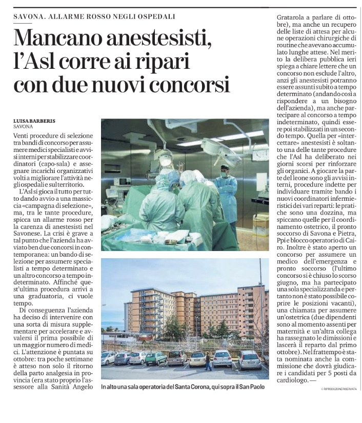 L’Asl si gioca il tutto per tutto dando avvio a una massiccia «campagna di selezione», ma, tra le tante procedure, spicca un allarme rosso per la carenza di anestesisti nel Savonese. La crisi è grave a tal punto che l’azienda ha avviato ben due concorsi in contemporanea: un bando di selezione per assumere specialisti a tempo determinato e un altro concorso a tempo indeterminato. Affinché quest’ultima procedura arrivi a una graduatoria, ci vuole tempo.