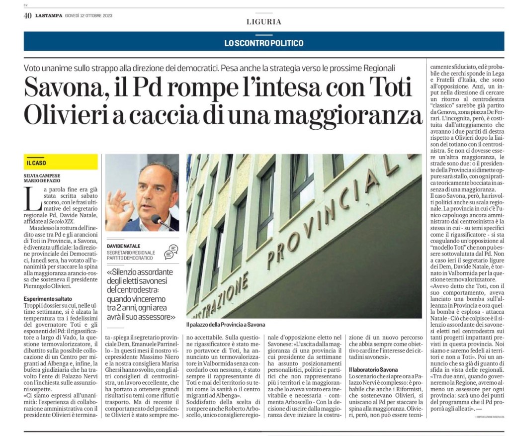 «Ci siamo espressi all’unanimità: l’esperienza di collaborazione amministrativa con il presidente Olivieri è terminata – spiega il segretario provinciale Dem, Emanuele Parrinello – In questi mesi il nostro vicepresidente Massimo Niero e la nostra consigliera Marisa Ghersi hanno svolto, con gli altri consiglieri di centrosinistra, un lavoro eccellente, che ha portato a ottenere grandi risultati su temi come rifiuti e trasporto. Ma di recente il comportamento del presidente Olivieri è stato sempre meno accettabile. Sulla questione rigassificatore è stato mero portavoce di Toti, ha annunciato un termovalorizzatore in Valbormida senza concordarlo con nessuno, è stato sempre il rappresentante di Toti e mai del territorio su temi come la sanità o il centro migranti ad Albenga».