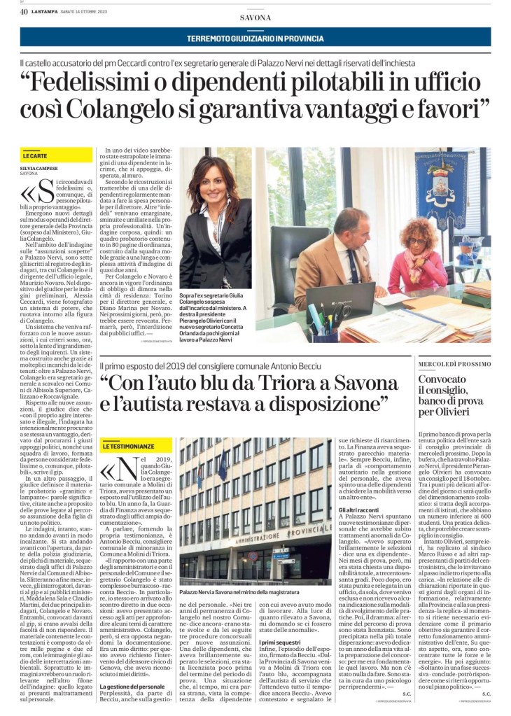 Nell’ambito dell’indagine sulle “assunzioni sospette” a Palazzo Nervi, sono sette gli iscritti al registro degli indagati, tra cui Colangelo e il dirigente dell’ufficio legale, Maurizio Novaro. Nel dispositivo del giudice per le indagini preliminari, Alessia Ceccardi, viene fotografato un sistema di potere, che ruotava intorno alla figura di Colangelo.