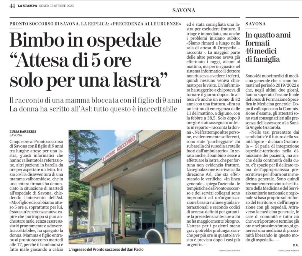 Cinque ore al Pronto soccorso di Savona con il figlio di 9 anni tra lunghe attese per una lastra, guasti informatici che hanno rallentato la refertazione, altri pazienti in barella da ore per aspettare un letto. Inizia così la disavventura di una mamma valbormidese, che in una lettera firmata ha denunciato la situazione di martedì all’ospedale di Savona, chiedendo l’intervento dell’Asl. «Mio figlio ed io abbiamo atteso 5 ore e, soprattutto per lui, è stata un’esperienza nuova capire che purtroppo si può anche stare male, senza essere assistiti prontamente e a dovere. Inaccettabile», ha spiegato la donna. Mamma e figlio entrano al pronto soccorso martedì alle 17, perché il bambino si è fatto male giocando a calcio ed è stata consigliata una lastra per escludere fratture. Il triage è immediato, ma anche i problemi iniziano subito: «Siamo rimasti a lungo nella sala di attesa di Ortopedia – racconta -. La maggior parte delle altre persone aveva già effettuato i raggi, alcuni al mattino, ma per un guasto nel sistema informatico il dottore non riusciva a vedere i referti, quindi nessuno veniva chiamato per le visite. Un’infermiera ha suggerito a chi poteva di tornare il giorno dopo». In attesa c’è anche un uomo di 82 anni con una frattura. «Era su un lettino di emergenza dalle 11 del mattino, a digiuno, con la febbre a 38,5. Solo dopo 9 ore gli è stato assegnato un letto in reparto – racconta la donna -. Nel frattempo altre persone, evidentemente sofferenti, sono state “parcheggiate” chi su barella chi su sedia a rotelle fuori dall’ambulatorio». In serata anche il bambino riesce a effettuare la lastra, che per fortuna non evidenzia fratture. La segnalazione è arrivata alla direzione Asl, che sta effettuando le verifiche. «In linea generale – spiega l’azienda – le tempistiche del Pronto soccorso e dei servizi collegati sono improntati ad un’organizzazione basata su linee guida internazionali e secondo codici di accesso definiti per garantire la precedenza alle cure a chi ne ha maggiormente bisogno. L’attesa per i pazienti meno gravi potrebbe prolungarsi anche per più ore in quanto la visita è prevista dopo i casi più urgenti».—