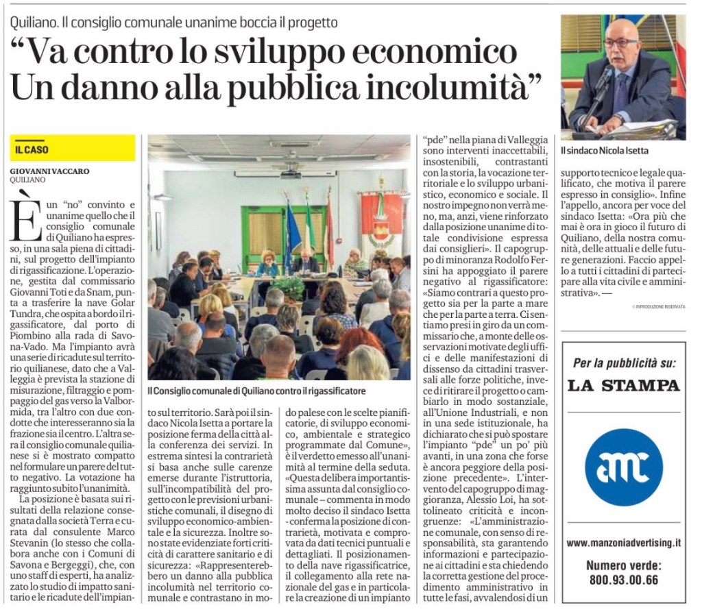La posizione è basata sui risultati della relazione consegnata dalla società Terra e curata dal consulente Marco Stevanin (lo stesso che collabora anche con i Comuni di Savona e Bergeggi), che, con uno staff di esperti, ha analizzato lo studio di impatto sanitario e le ricadute dell’impianto sul territorio. Sarà poi il sindaco Nicola Isetta a portare la posizione ferma della città alla conferenza dei servizi. In estrema sintesi la contrarietà si basa anche sulle carenze emerse durante l’istruttoria, sull’incompatibilità del progetto con le previsioni urbanistiche comunali, il disegno di sviluppo economico-ambientale e la sicurezza. Inoltre sono state evidenziate forti criticità di carattere sanitario e di sicurezza: «Rappresenterebbero un danno alla pubblica incolumità nel territorio comunale e contrastano in modo palese con le scelte pianificatorie, di sviluppo economico, ambientale e strategico programmate dal Comune», è il verdetto emesso all’unanimità al termine della seduta. «Questa delibera importantissima assunta dal consiglio comunale – commenta in modo molto deciso il sindaco Isetta – conferma la posizione di contrarietà, motivata e comprovata da dati tecnici puntuali e dettagliati. Il posizionamento della nave rigassificatrice, il collegamento alla rete nazionale del gas e in particolare la creazione di un impianto “pde” nella piana di Valleggia sono interventi inaccettabili, insostenibili, contrastanti con la storia, la vocazione territoriale e lo sviluppo urbanistico, economico e sociale. Il nostro impegno non verrà meno, ma, anzi, viene rinforzato dalla posizione unanime di totale condivisione espressa dai consiglieri». Il capogruppo di minoranza Rodolfo Fersini ha appoggiato il parere negativo al rigassificatore: «Siamo contrari a questo progetto sia per la parte a mare che per la parte a terra. Ci sentiamo presi in giro da un commissario che, a monte delle osservazioni motivate degli uffici e delle manifestazioni di dissenso da cittadini trasversali alle forze politiche, invece di ritirare il progetto o cambiarlo in modo sostanziale, all’Unione Industriali, e non in una sede istituzionale, ha dichiarato che si può spostare l’impianto “pde” un po’ più avanti, in una zona che forse è ancora peggiore della posizione precedente». L’intervento del capogruppo di maggioranza, Alessio Loi, ha sottolineato criticità e incongruenze: «L’amministrazione comunale, con senso di responsabilità, sta garantendo informazioni e partecipazione ai cittadini e sta chiedendo la corretta gestione del procedimento amministrativo in tutte le fasi, avvalendosi di un supporto tecnico e legale qualificato, che motiva il parere espresso in consiglio». Infine l’appello, ancora per voce del sindaco Isetta: «Ora più che mai è ora in gioco il futuro di Quiliano, della nostra comunità, delle attuali e delle future generazioni. Faccio appello a tutti i cittadini di partecipare alla vita civile e amministrativa».