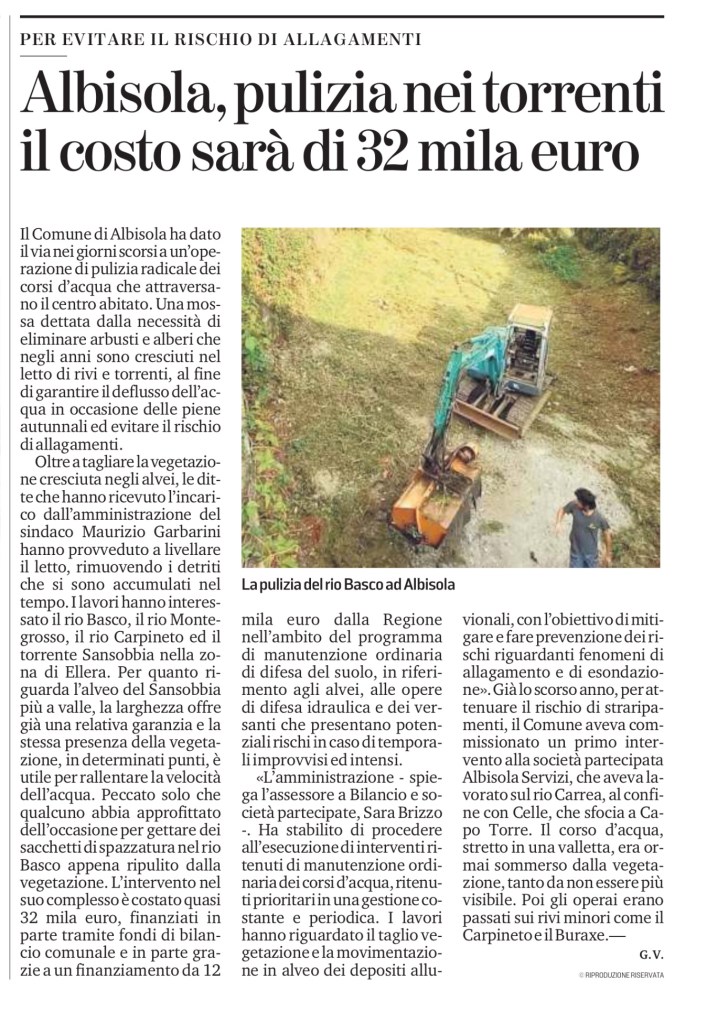 Il Comune di Albisola ha dato il via nei giorni scorsi a un’operazione di pulizia radicale dei corsi d’acqua che attraversano il centro abitato. Una mossa dettata dalla necessità di eliminare arbusti e alberi che negli anni sono cresciuti nel letto di rivi e torrenti, al fine di garantire il deflusso dell’acqua in occasione delle piene autunnali ed evitare il rischio di allagamenti.