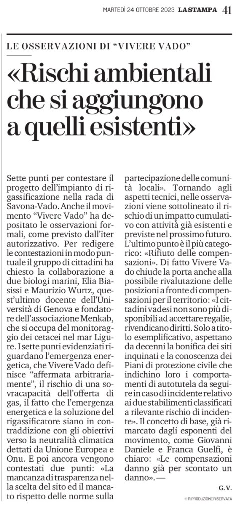 Sette punti per contestare il progetto dell’impianto di rigassificazione nella rada di Savona-Vado. Anche il movimento “Vivere Vado” ha depositato le osservazioni formali, come previsto dall’iter autorizzativo. Per redigere le contestazioni in modo puntuale il gruppo di cittadini ha chiesto la collaborazione a due biologi marini, Elia Biasissi e Maurizio Wurtz, quest’ultimo docente dell’Università di Genova e fondatore dell’associazione Menkab, che si occupa del monitoraggio dei cetacei nel mar Ligure. I sette punti evidenziati riguardano l’emergenza energetica, che Vivere Vado definisce “affermata arbitrariamente”, il rischio di una sovracapacità dell’offerta di gas, il fatto che l’emergenza energetica e la soluzione del rigassificatore siano in contraddizione con gli obiettivi verso la neutralità climatica dettati da Unione Europea e Onu. E poi ancora vengono contestati due punti: «La mancanza di trasparenza nella scelta del sito ed il mancato rispetto delle norme sulla partecipazione delle comunità locali». Tornando agli aspetti tecnici, nelle osservazioni viene sottolineato il rischio di un impatto cumulativo con attività già esistenti e previste nel prossimo futuro. L’ultimo punto è il più categorico: «Rifiuto delle compensazioni». Di fatto Vivere Vado chiude la porta anche alla possibile rivalutazione delle posizioni a fronte di compensazioni per il territorio: «I cittadini vadesi non sono più disponibili ad accettare regalie, rivendicano diritti. Solo a titolo esemplificativo, aspettano da decenni la bonifica dei siti inquinati e la conoscenza dei Piani di protezione civile che indichino loro i comportamenti di autotutela da seguire in caso di incidente relativo ai due stabilimenti classificati a rilevante rischio di incidente». Il concetto di base, già rimarcato dagli esponenti del movimento, come Giovanni Daniele e Franca Guelfi, è chiaro: «Le compensazioni danno già per scontato un danno». —