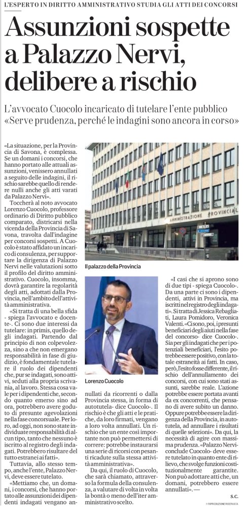 Toccherà al noto avvocato Lorenzo Cuocolo, professore ordinario di Diritto pubblico comparato, districarsi nella vicenda della Provincia di Savona, travolta dall’indagine per concorsi sospetti. A Cuocolo è stato affidato un incarico di consulenza, per supportare la dirigenza di Palazzo Nervi nelle valutazioni sotto il profilo del diritto amministrativo. Cuocolo, insomma, dovrà garantire la regolarità degli atti, adottati dalla Provincia, nell’ambito dell’attività amministrativa.