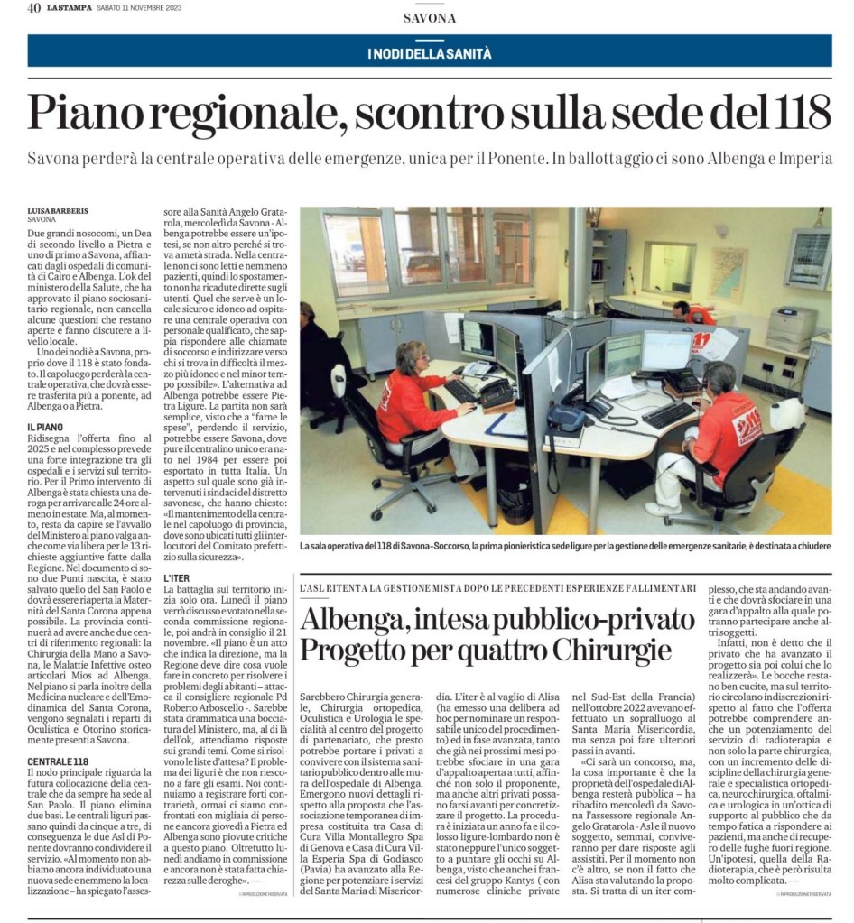 Il nodo principale riguarda la futura collocazione della centrale che da sempre ha sede al San Paolo. Il piano elimina due basi. Le centrali liguri passano quindi da cinque a tre, di conseguenza le due Asl di Ponente dovranno condividere il servizio. «Al momento non abbiamo ancora individuato una nuova sede e nemmeno la localizzazione – ha spiegato l’assessore alla Sanità Angelo Gratarola, mercoledì da Savona – Albenga potrebbe essere un’ipotesi, se non altro perché si trova a metà strada. Nella centrale non ci sono letti e nemmeno pazienti, quindi lo spostamento non ha ricadute dirette sugli utenti. Quel che serve è un locale sicuro e idoneo ad ospitare una centrale operativa con personale qualificato, che sappia rispondere alle chiamate di soccorso e indirizzare verso chi si trova in difficoltà il mezzo più idoneo e nel minor tempo possibile». L’alternativa ad Albenga potrebbe essere Pietra Ligure. La partita non sarà semplice, visto che a “farne le spese”, perdendo il servizio, potrebbe essere Savona, dove pure il centralino unico era nato nel 1984 per essere poi esportato in tutta Italia. Un aspetto sul quale sono già intervenuti i sindaci del distretto savonese, che hanno chiesto: «Il mantenimento della centrale nel capoluogo di provincia, dove sono ubicati tutti gli interlocutori del Comitato prefettizio sulla sicurezza».